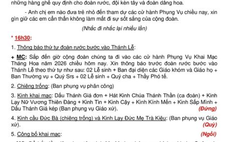 Thứ 4: 04h45 và 17h00 (Đền Mẹ Tri Ân)
