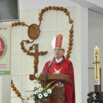 Sau phần công bố Tin Mừng, cha quản xứ Gioan giới thiệu 60 ứng viên chuẩn bị lãnh nhận Bí tích Thêm Sức với Đức Cha Giuse và xin Đức Cha ban phép Thêm Sức cho các em. Tiếp đến, Đức Cha ban huấn từ cho cộng đoàn phụng vụ. Với các bài đọc trong phần phụng vụ Lời Chúa hôm nay, Đức Cha Giuse mời mỗi người hãy mau mắn đáp trả Lời Chúa và giữ tâm hồn mình thanh thản để lên đường loan báo Tin Mừng nước Chúa; hãy trở nên chứng tá của Ngài để chuyển tải phúc lành của Chúa hầu cho Lòng Thương Xót Chúa được hiện diện trong đời sống. Đối với các em đang chờ đợi lãnh nhận bí tích Thêm Sức, ngài mời gọi các em hãy biết chờ đợi cùng Đức Mẹ trong cầu nguyện, trong đức tin và trong hy vọng như các Thánh Tông Đồ xưa, để rồi sẽ được Thánh Thần biến đổi. Sẽ không có lửa, gió như xưa, nhưng hãy cảm nhận đức tin của Giáo hội, của cha ông tổ tiên từ xưa đến nay… để thấy sức mạnh của Thánh Thần hoạt động sẽ được ban cho các con qua Đấng kế vị các Tông đồ bằng dấu ấn vĩnh viễn. Hãy mở con tim, ra khỏi sự sợ hãi, hận thù, khiên cưỡng… và ra đi loan báo Tin Vui Mừng. Chắc chắn có nhiều thử thách trên đường, nhưng với ơn Chúa Thánh Thần sẽ giúp các con phân định được đúng sai để thực thi giá trị đẹp nhất “Hãy đi loan báo Tin Mừng khắp thế gian” hầu mang lại các hoa trái “bác ái, hoan lạc, bình an, nhẫn nhục, nhân hậu, từ tâm, trung tín, hiền hoà, tiết độ” cho cộng đoàn.
