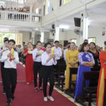 Ngay từ 08h00 sáng 15/7/2018, cha quản xứ Gioan, cha phó xứ Antôn, cha mới Giuse Nguyễn Hùng đang giúp mục vụ trong tuần vừa rồi, Hội đồng mục vụ giáo xứ, 60 em sắp lãnh nhận bí tích Thêm Sức cùng với quý phụ huynh đã đứng thành hàng trước cổng chào của giáo xứ để chào đón Đức Cha Giuse. Đúng 08h10, bóng dáng vị cha chung mến yêu đã xuất hiện trong tiếng chuông rộn rã, tiếng kèn vang và tiếng vỗ tay không ngừng của cộng đoàn giáo xứ dành cho ngài. Sau khi vẫy chào đoàn chiên thân thương, Đức Cha Giuse tiến lên ngôi Thánh đường ghi dấu ấn Mẹ Hiền năm nào để hôn kính Thánh Giá Chúa và bái chầu Thánh Thể. 08h30, trong tiếng kèn trầm hùng của đội kèn Tây giáo xứ, đoàn rước dần tiến vào Thánh đường, dẫn đầu với Thánh Giá, đèn hầu, tiếp đến là quý ông bà trong Hội đồng mục vụ giáo xứ, đến các em chuẩn bị lãnh nhận bí tích Thêm sức, quý phụ huynh/vú bọ, quý cha đồng tế: cha quản xứ Gioan, cha phó xứ Antôn, cha Chánh văn phòng Phaolô và cuối cùng là Đức Cha chủ tế Giuse.