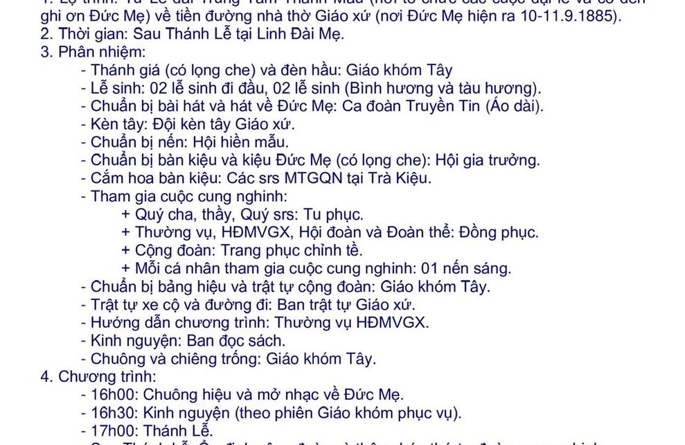 Thứ 4: 04h45 và 17h00 (Đền Mẹ Tri Ân)