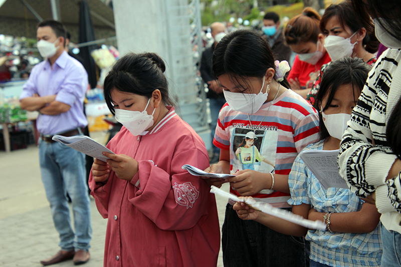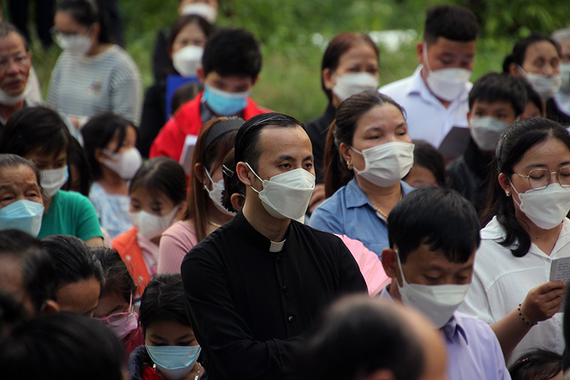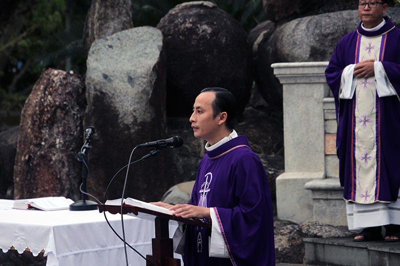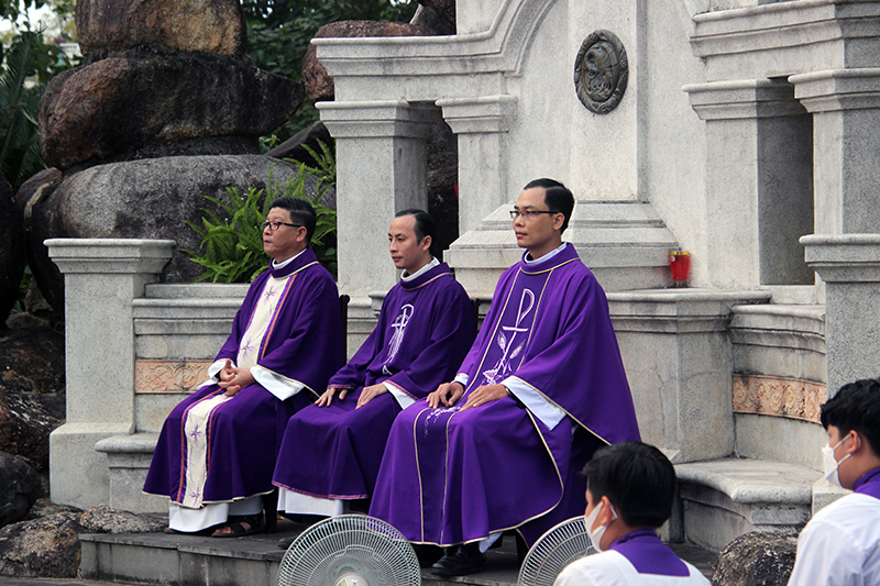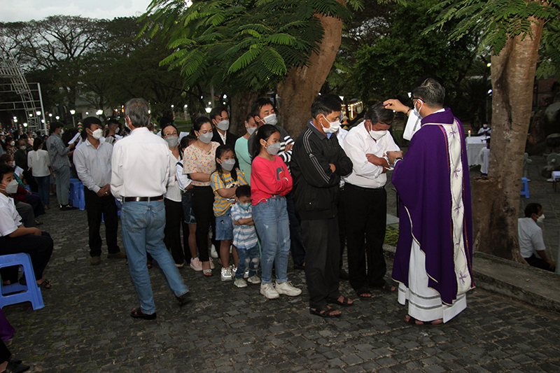 Sau khi đi qua những đau đớn, cực hình mà Chúa Giê-su đã chịu để tỏ bày Tình Yêu vô vị lợi mà Thiên Chúa dành cho nhân loại, cộng đoàn phụng vụ tiếp tục hiệp dâng Thánh lễ của ngày thứ Tư lễ Tro, thời điểm bắt đầu mùa Chay Thánh. Mở đầu Thánh lễ, cha chủ tế Đa-minh chia sẻ về những biến cố dịch bệnh, chiến tranh… đang xảy ra trên thế giới để thấy sự hư vô của đời người. Từ đó ngài nhắc nhớ cộng đoàn phụng vụ về ý nghĩa của việc xức tro giúp mọi người nhìn nhận sự hư vô của mình, hầu biết tin tưởng tuyệt đối vào Thiên Chúa – Đấng đảm bảo sự sống đời đời cho mỗi người. Dịp này, ngài cũng mời gọi cộng đoàn phụng vụ hãy cầu nguyện cho đất nước Ukraine sớm có được hòa bình.