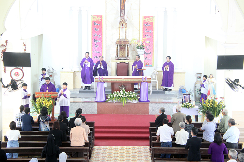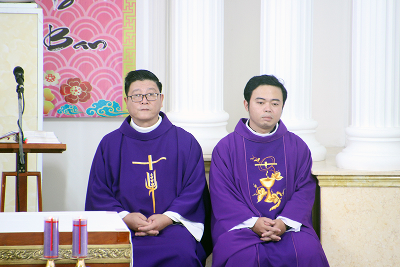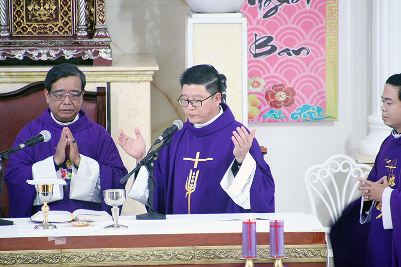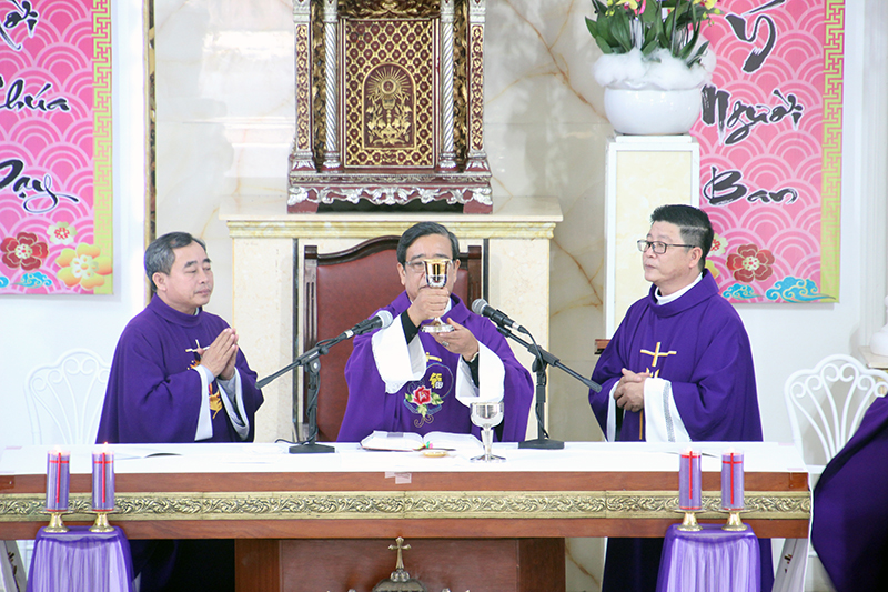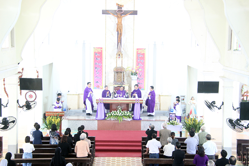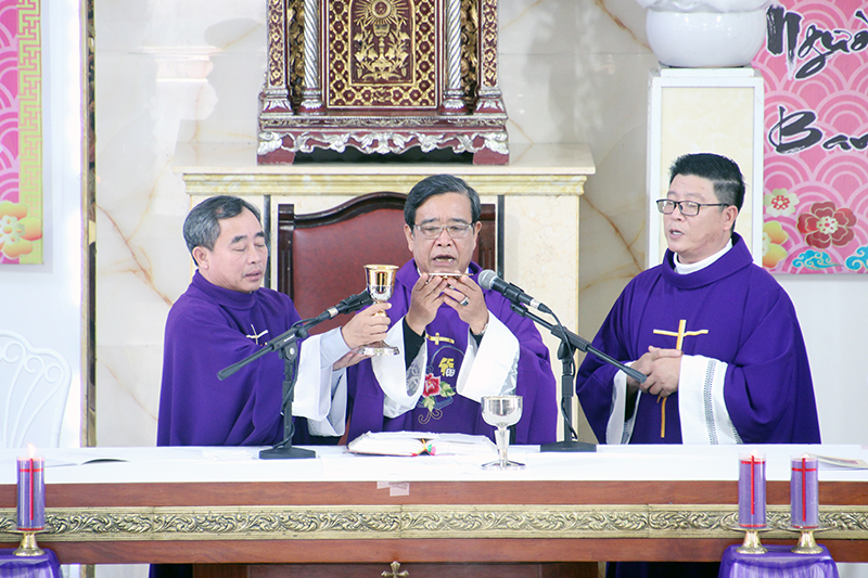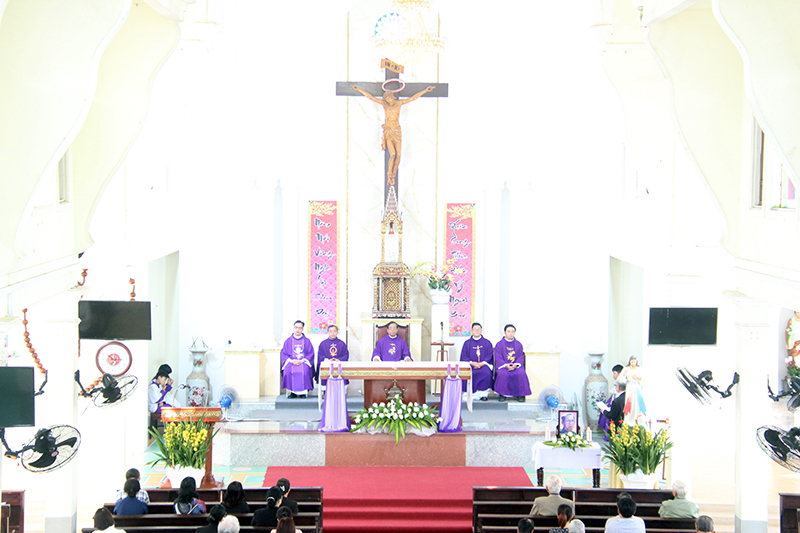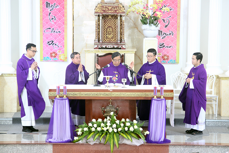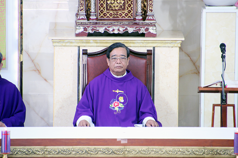 Trong bài giảng của mình, Cha Simon mượn bài hát “Những gì sẽ đem theo vào cõi chết” của nhạc sĩ Phạm Duy để mời gọi cộng đoàn phụng vụ cùng suy ngẫm về những gì đã làm nơi cuộc sống thế trần, để đến ngày “ra đi” mỗi người sẽ đem theo được những gì? Từ đó, ngài ví cuộc sống của mỗi người giống như một sân khấu, ở đó có khởi đầu và kết thúc, có mở màn và hạ màn, có lúc diễn dở và có lúc diễn hay, nhưng tất cả đều nỗ lực hoàn thiện mỗi ngày để mong rằng sẽ nhận được những tiếng vỗ tay khi kết thúc của vở kịch cuộc đời. Và trên hết là nhận được sự ghi nhận của vị “đạo diễn toàn năng” – Thiên Chúa. Nhưng làm thế nào để sống, “diễn” tốt vai diễn của mình, Cha Simon đã mời gọi cộng đoàn cùng định vị lại bản thân để từ đó sống ba chiều kích mà Đức Hồng Y F.X Nguyễn Văn Thuận đã đề cập: “Chiều cao là yêu mến trung thành với Thiên Chúa, chiều sâu là yêu mến quê hương, kính nhớ tổ tiên, sống trưởng thành trong các chọn lựa, còn chiều rộng là thể hiện tinh thần trách nhiệm trong mối tương quan với mọi người”. Có sống như vậy thì mỗi người mới có thể diễn tròn vai và để lại tiếng thơm giữa đời. Như Cha cố Phê-rô mà chúng ta tưởng nhớ hôm nay, ngài đã ra đi trong tuổi già, ai cũng thương tiếc. Và qua đời sống của ngài đã để lại bao kinh nghiệm mục vụ cho các linh mục đàn em, những kinh nghiệm sống cho anh chị em giáo dân, cũng như các công trình mục vụ cho giáo phận. Kết thúc bài giảng, Cha Simon mời gọi cộng đoàn phụng vụ hãy nài xin Chúa đón nhận Cha cố vào hưởng phúc thiên đàng và cầu nguyện cho mỗi người biết sống hiệp nhất xây dựng Giáo Hội để loan báo Tin Mừng cho anh chị em xung quanh như Cha cố đã từng.