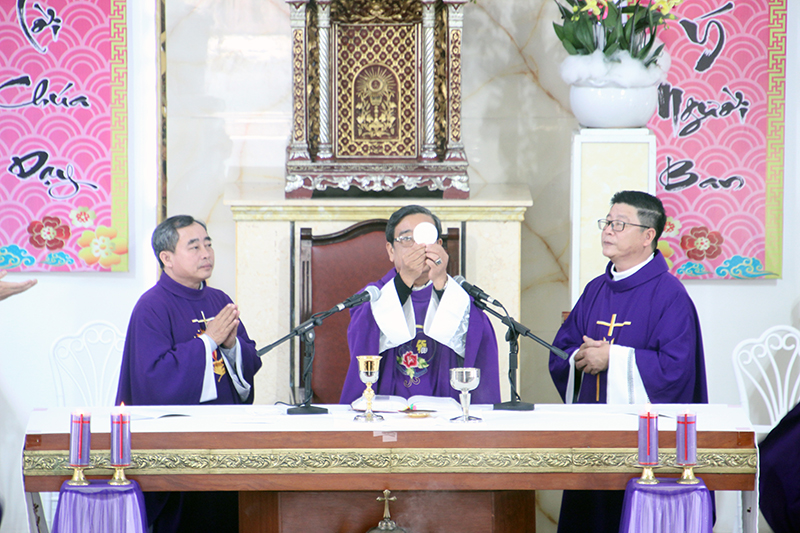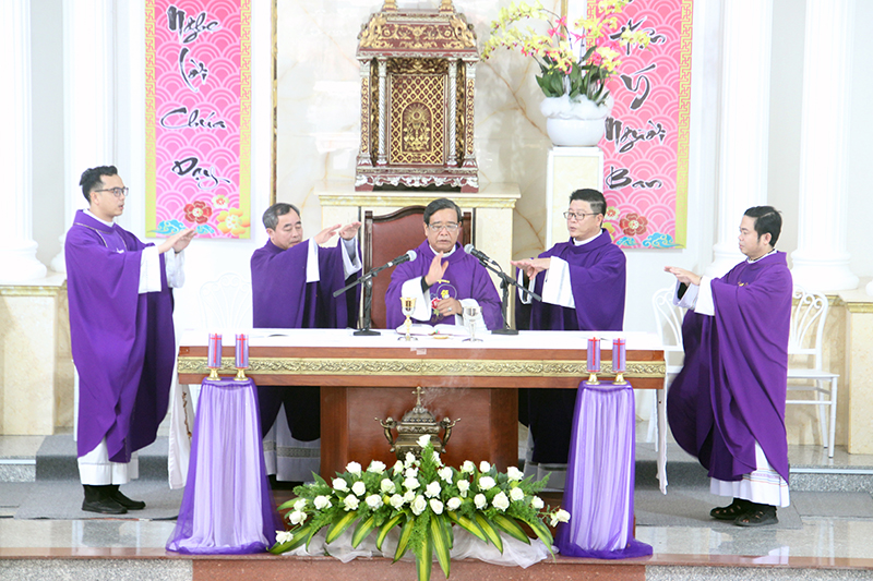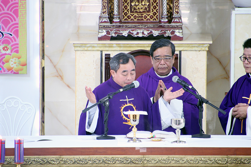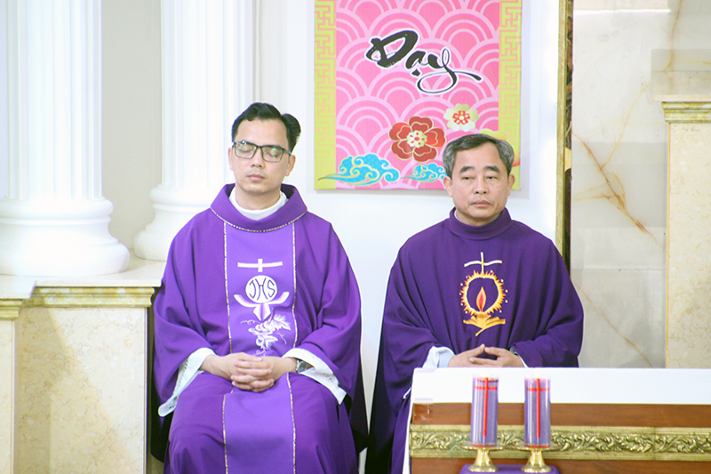 Mở đầu Thánh lễ, Cha chủ tế Giuse Maria mời gọi cộng đoàn phụng vụ đang quy tụ nơi ngôi thánh đường ghi đậm dấu ấn của Cha cố Phê-rô, cùng cầu nguyện cho ngài được mau hưởng phúc trường sinh.