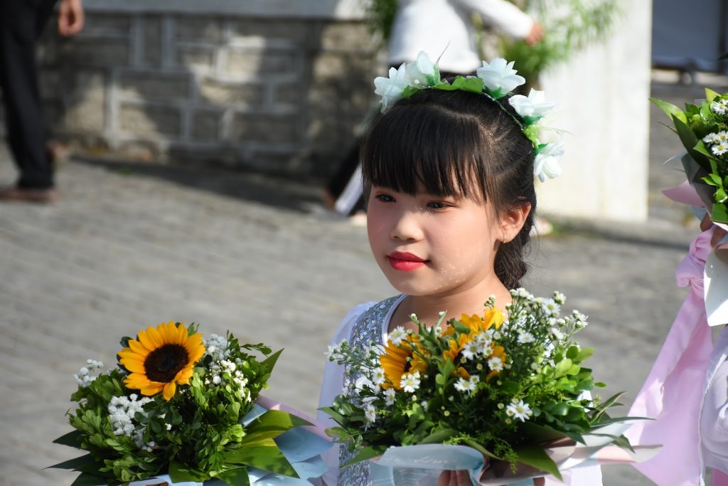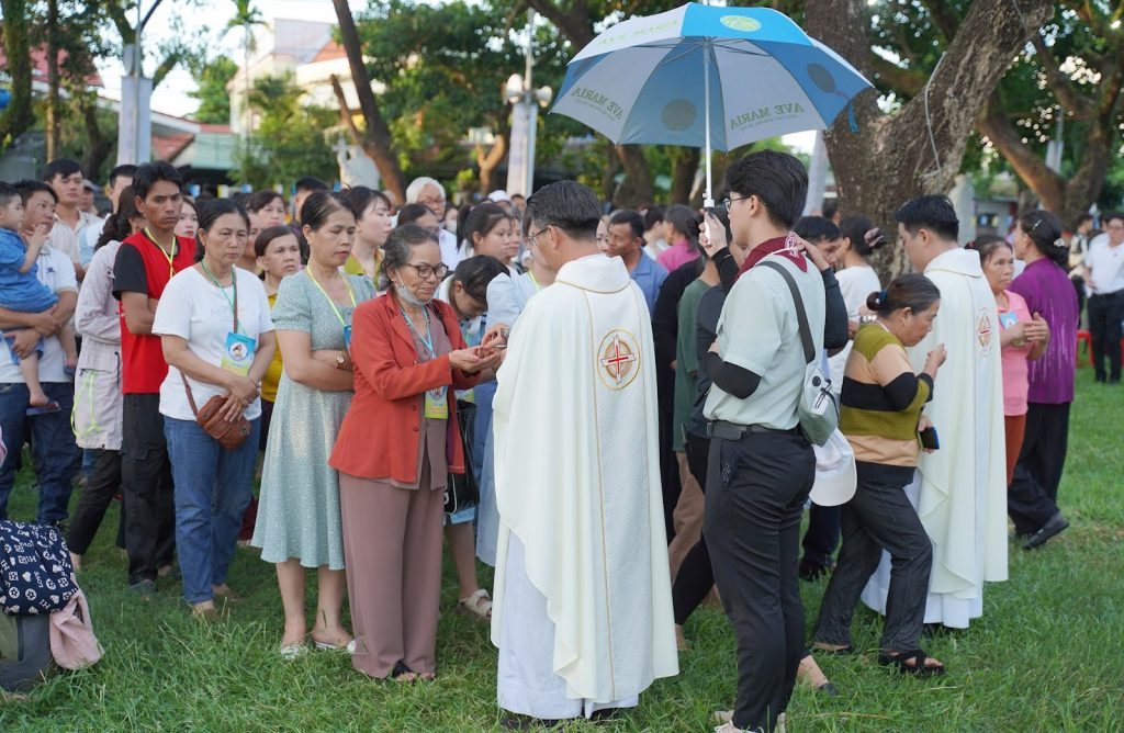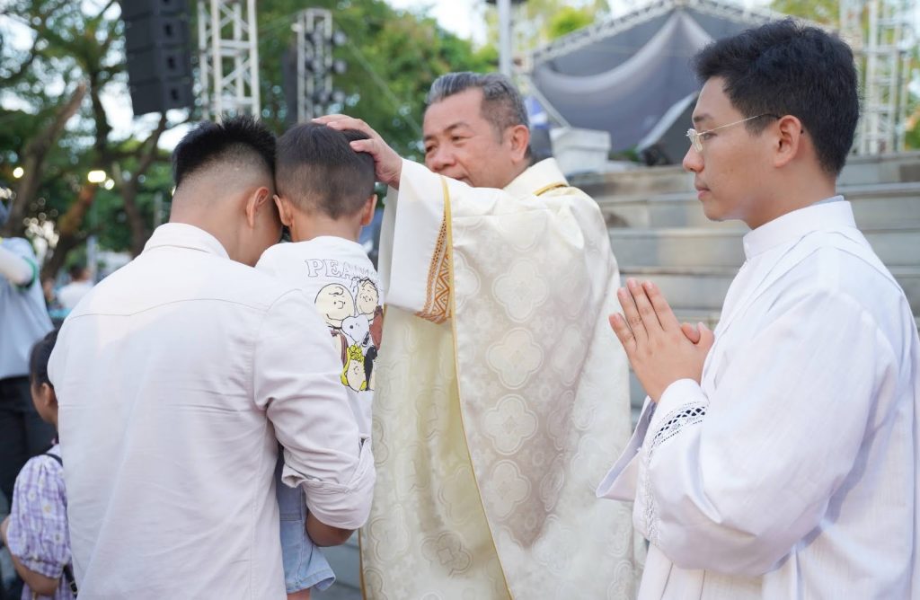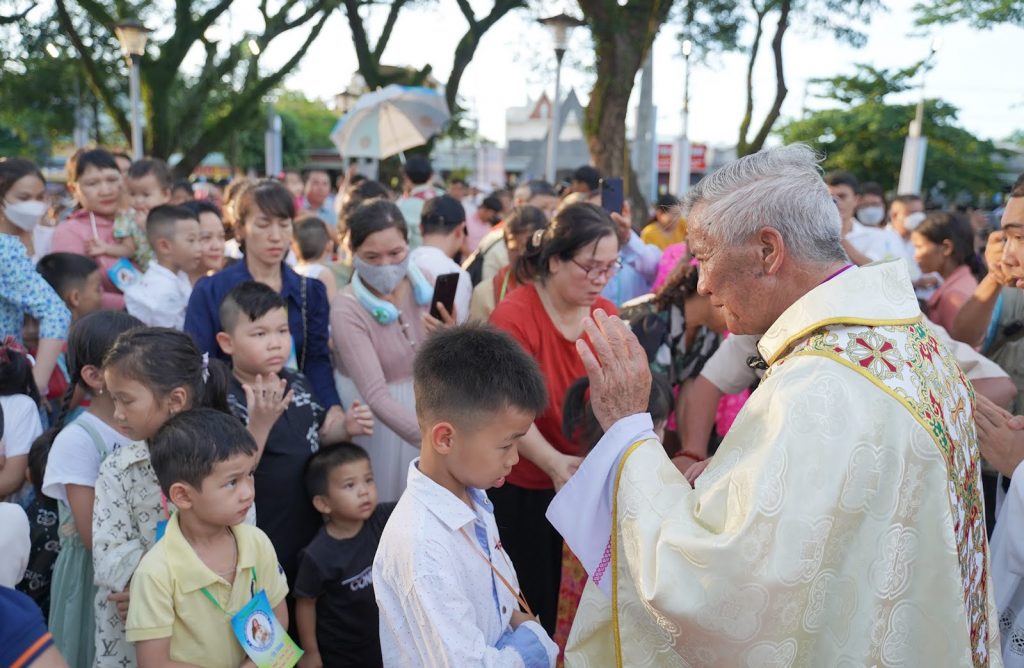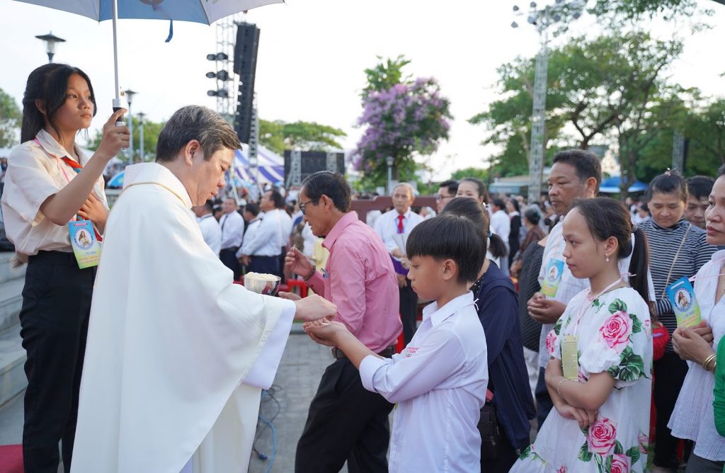 Đặc biệt trong phần rước lễ, hai Đức Cha đã xuống tận sân lễ đài để đặt tay ban bình an cho các em bé.