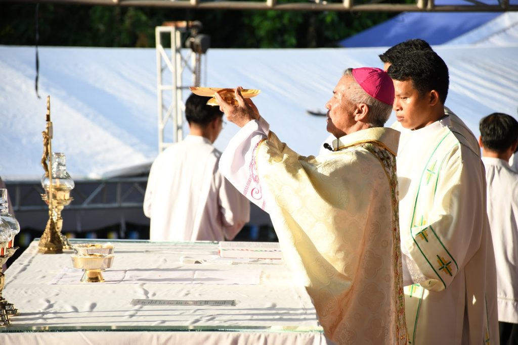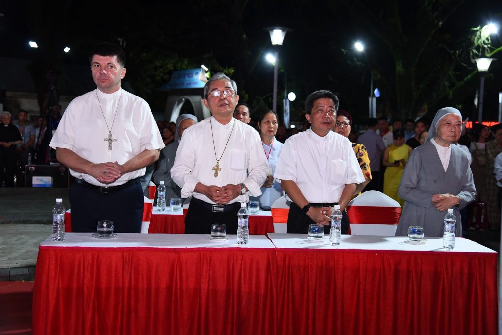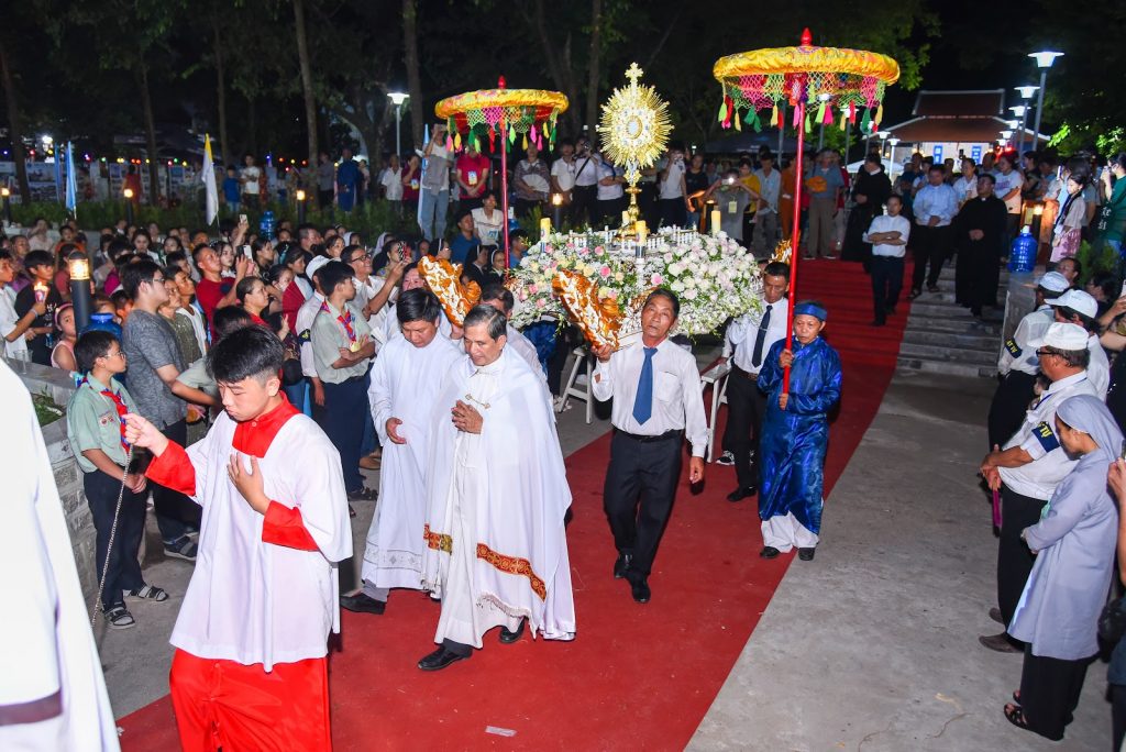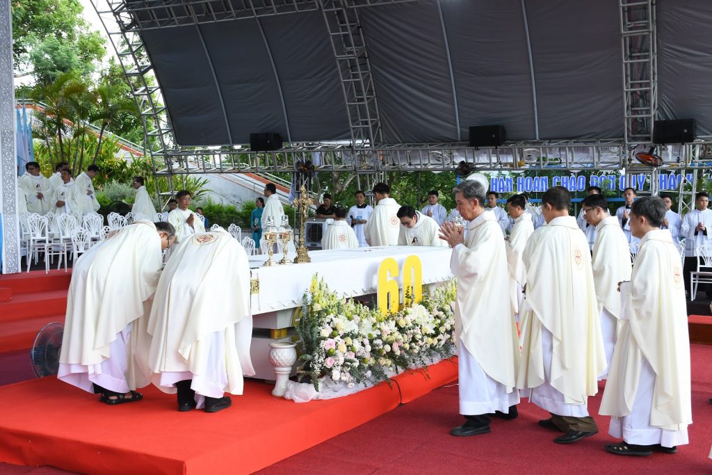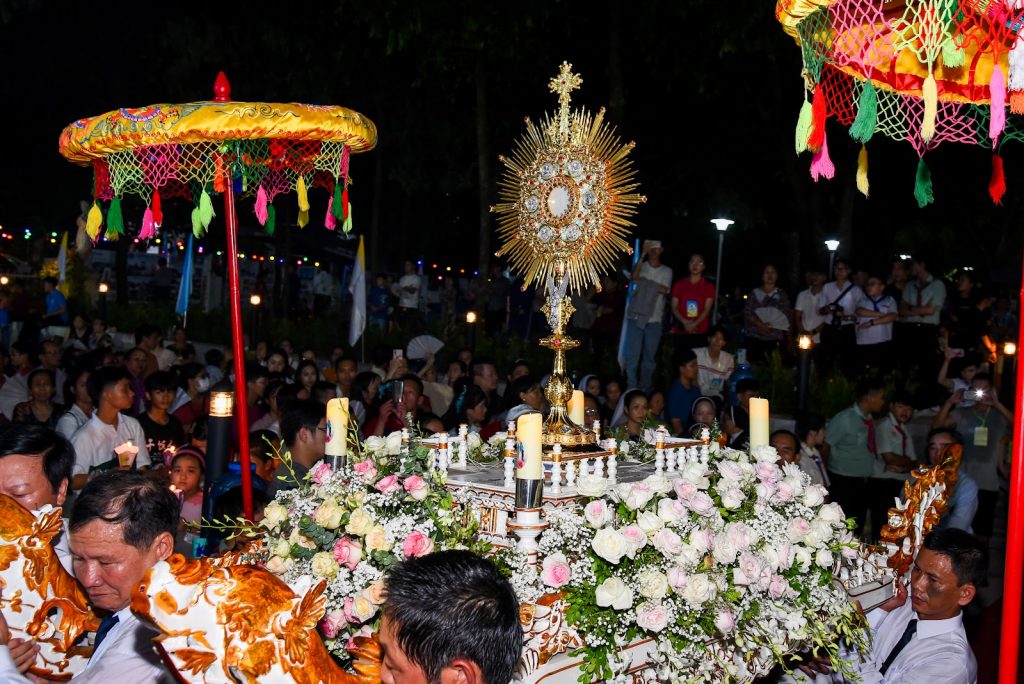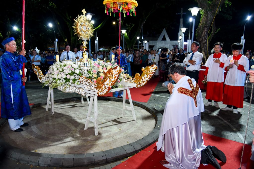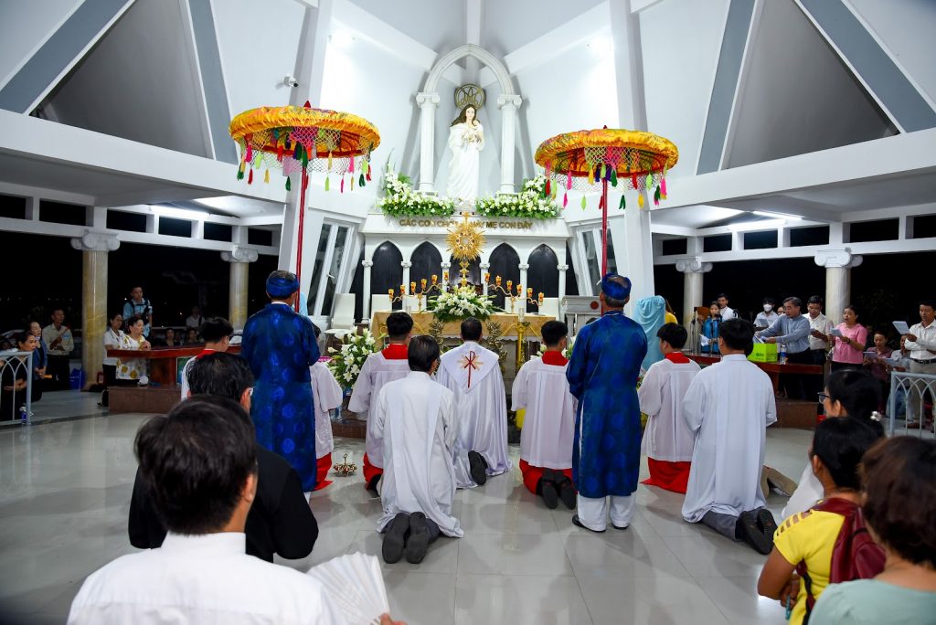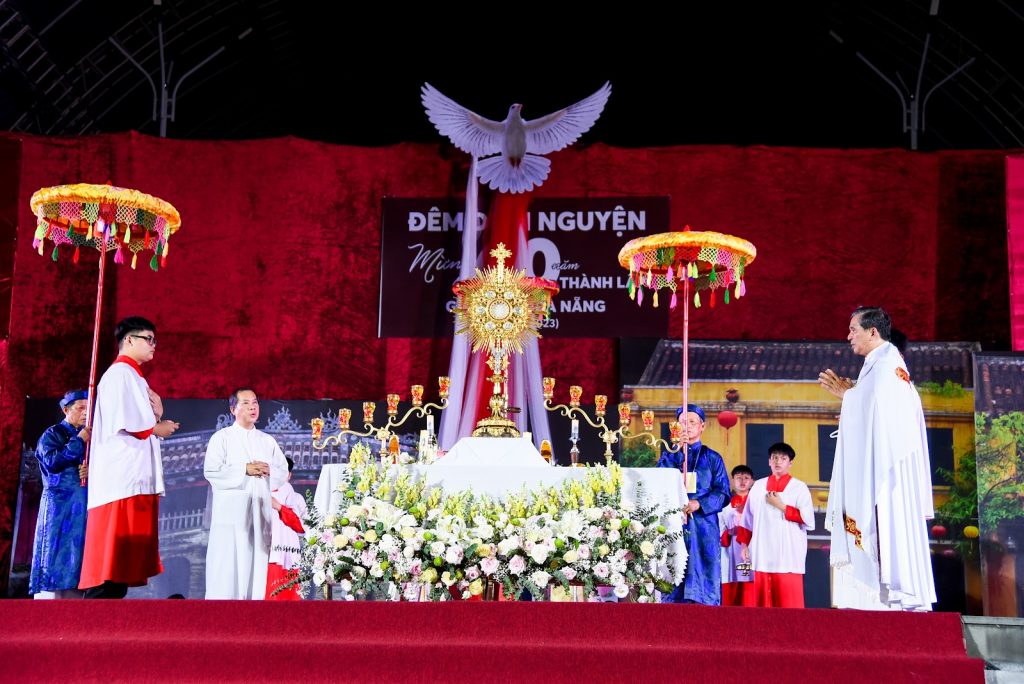 Liền sau diễn nguyện, cộng đoàn lại tiếp tục cử hành thánh thiêng: Cung nghinh và Chầu Thánh Thể do quý Cha Dòng Thánh Thể phụ trách. Thật xúc động gần như tất cả cộng đoàn vẫn tiếp tục ở lại tham dự cử hành này nhất là giờ chầu đầu tiên ngay tại lễ đài. Sau đó, Thánh Thể được cung nghinh lên Linh đài và được các dòng tu đảm nhận cho đến sáng mai. Xin Chúa luôn ở cùng chúng con, Giáo phận Đà Nẵng mọi ngày cho đến tận thế.