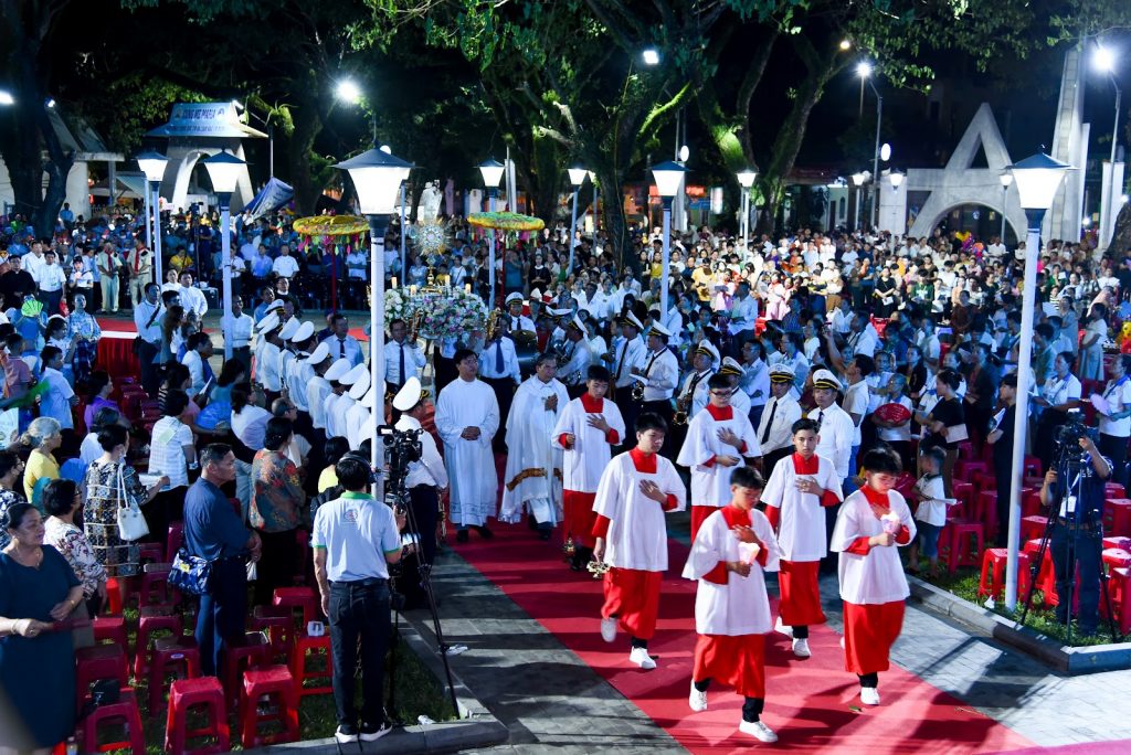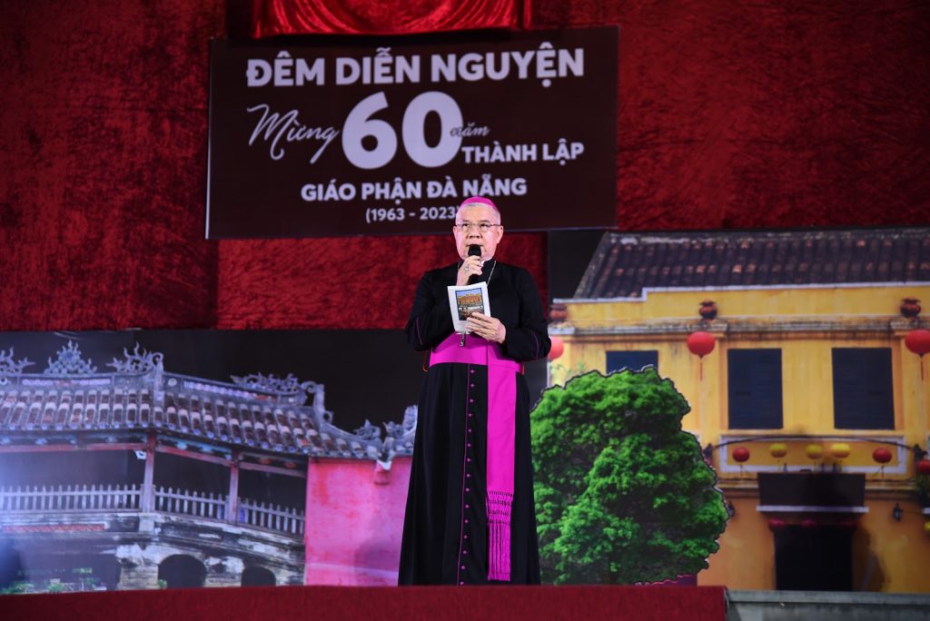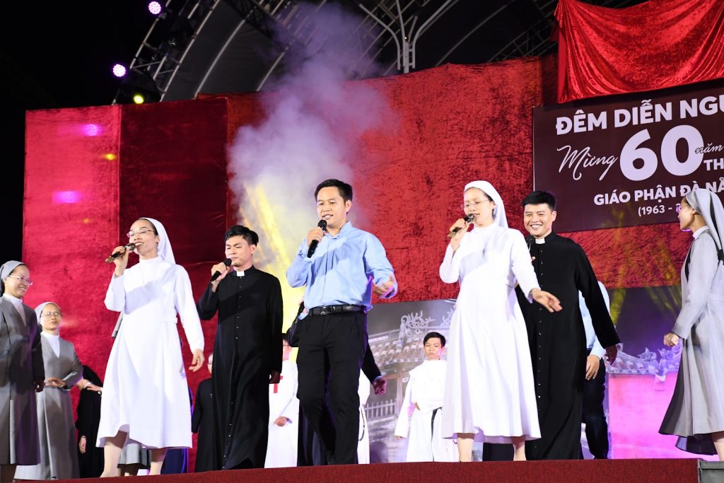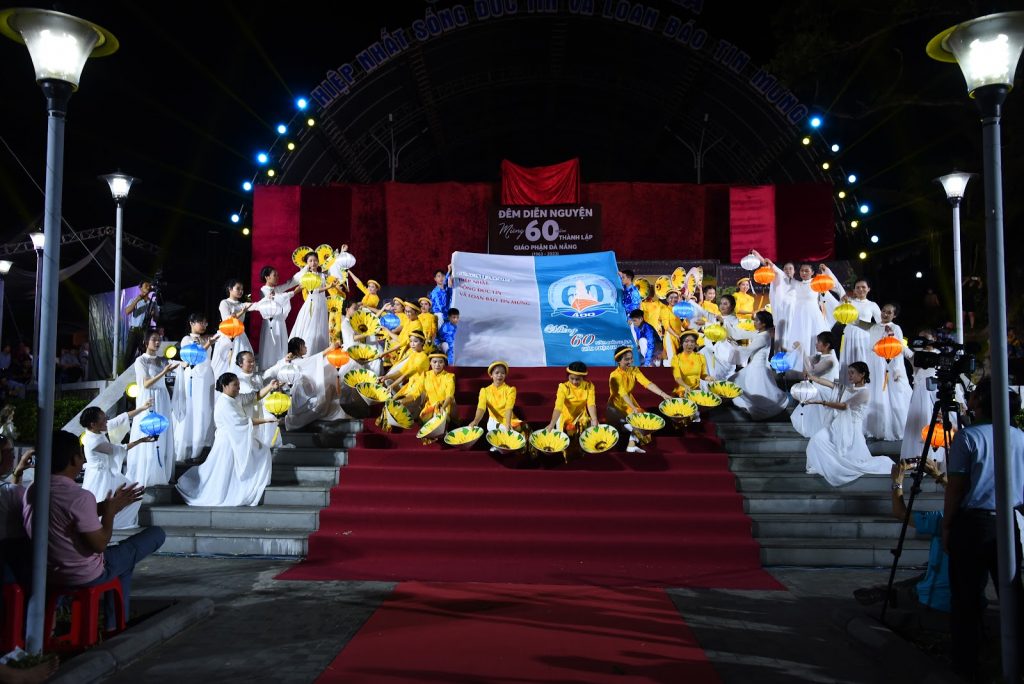 Sau Thánh Lễ một giờ, đêm diễn nguyện bắt đầu lúc 19g30, Toàn thể cộng đoàn dân Chúa vui mừng và hân hạnh có sự hiện diện của Đức Khâm Sứ Tòa Thánh – Tổng Giám mục Mares Zalewski, Đức Cha Giuse Nguyễn Năng – Chủ tịch Hội đồng Giám mục Việt Nam – Tổng Giám mục Giáo phận Sài Gòn; Cha Luis Nguyễn Anh Tuấn, Giám mục Giáo phận Hà Tĩnh. Với 328 diễn viên đến từ các giáo xứ, hội đoàn, dòng tu trong giáo phận, liền mạch đêm diễn nguyện đã dẫn dắt cộng đoàn ôn lại ký ức oai hùng và đầy đau thương thử thách của Giáo phận chúng ta từ khi đón nhận hạt giống đức tin đầu tiên đến tâm tình TẠ ƠN và CẦU XIN Thiên Chúa nhờ lời chuyển cầu của Mẹ Trà Kiệu và Chân phước Anrê Phú Yên nâng đỡ, trợ giúp cho mọi thành phần dân Chúa trong giáo phận có thể vượt qua mọi thử thách như đã từng.