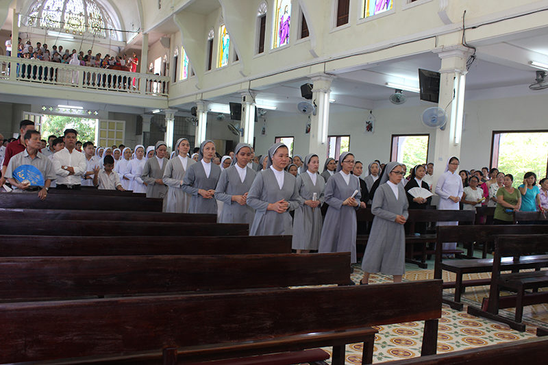 Sau Thánh lễ mừng Kim Khánh tu dòng lúc 05h00 sáng nay tại nhà thờ Chính Tòa, sơ Josephine Vũ Thị Minh đã cùng với sơ Anna Đoàn Thị Điệp, sơ Agnes Lưu Thị Lý (người con xứ Trà), sơ Elisabeth Trương Thị Bảo Ngân (người con xứ Trà) và cộng đoàn dân Chúa đất Mẹ hiệp dâng Thánh lễ tạ ơn lúc 17h00 tại ngôi thánh đường thân thương của giáo xứ để mừng Kim Khánh, Ngân Khánh, Vĩnh Khấn của mình.