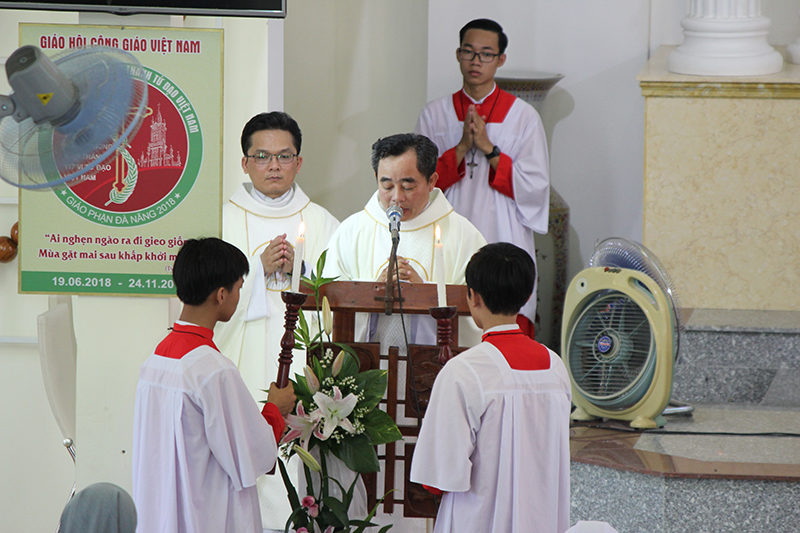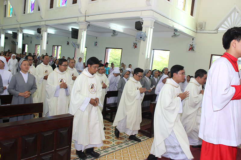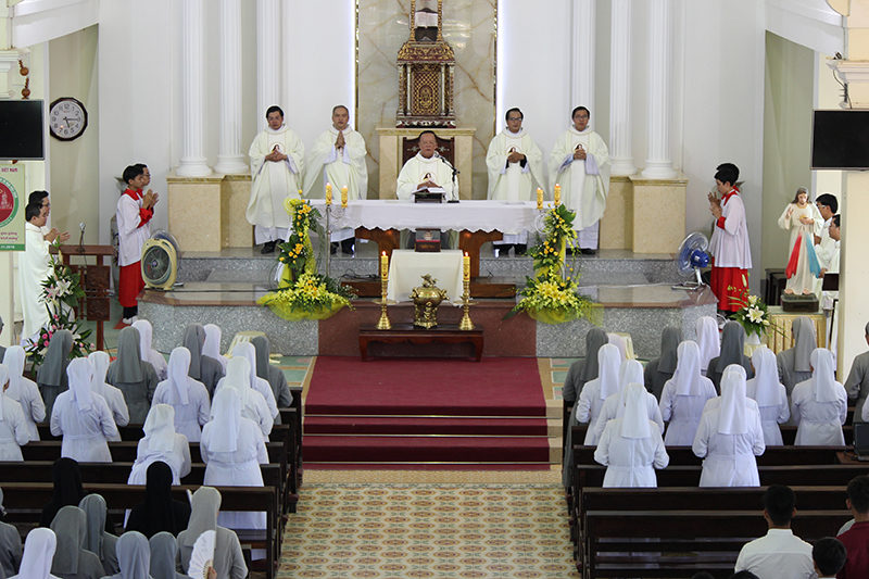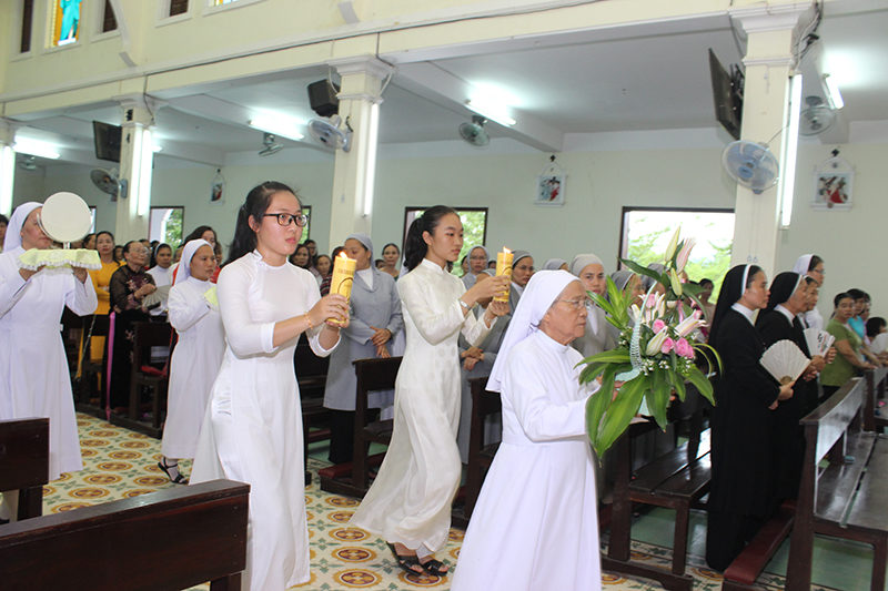 Trước khi bắt đầu Thánh lễ, cha quản xứ Gioan giới thiệu cha chủ tế Phaolô Maria Trần Quốc Việt – đại diện Giám mục, hạt trưởng hạt Tam Kỳ, nguyên phó xứ Trà Kiệu; quý cha đồng tế; sơ Saint Jean de Marie Trần Thị Anh- giám tỉnh dòng Thánh Phaolô Hà Nội và là người con của giáo xứ; quý sơ dòng Thánh Phaolô Đà Nẵng cùng cộng đoàn phụng vụ hiện diện trong Thánh lễ tạ ơn hồng ân Kim Khánh của sơ Josephine Minh, sơ Anna Điệp, Ngân Khánh của sơ Agnes Lý, Vĩnh khấn của sơ Elisabeth Ngân. Qua đó, ngài mời gọi cộng đoàn phụng vụ cùng chung chia niềm vui với quý sơ cùng gia đình, cũng như hiệp lời cầu nguyện cho quý sơ trong Thánh lễ tạ ơn hôm nay.
