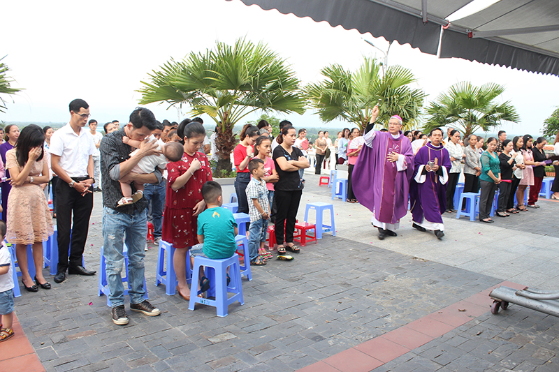 Sau khi làm phép nước, ảnh tượng, Đức Cha Giuse chia sẻ ngài rất vui khi đến với vùng đất thánh bởi được thấy công trình đài Mẹ đã hoàn thành với quảng trường khang trang, đồi Canvê, 14 chặng đàng Thánh giá… Ngài ngỏ lời cảm ơn cha Gioan – Giám đốc TTTM Trà Kiệu, cha phó Giuse, Hội đồng mục vụ giáo xứ và tất cả anh chị em giáo dân của giáo xứ đã cùng cộng tác và tôn tạo công trình đài Mẹ. Với kết quả này, chúng ta có quyền hãnh diện và tự tin để chuẩn bị cho dịp đại lễ hành hương sắp đến. Đó không chỉ đem lại vinh dự cho Giáo phận mà còn cho giáo xứ Trà Kiệu nữa vì linh địa này đã, đang và sẽ là điểm đến cho đoàn dân Chúa. Ngài ước mong mỗi giáo dân Trà Kiệu cũng sẽ là điểm sáng để đón tiếp những khách hành hương bằng đời sống gương mẫu của mình. Ngài cầu chúc mọi điều tốt đẹp nhất đến với cộng đoàn hôm nay. Và Thánh lễ kết thúc với phép lành trọng thể từ Đức Cha chủ tế.