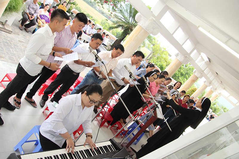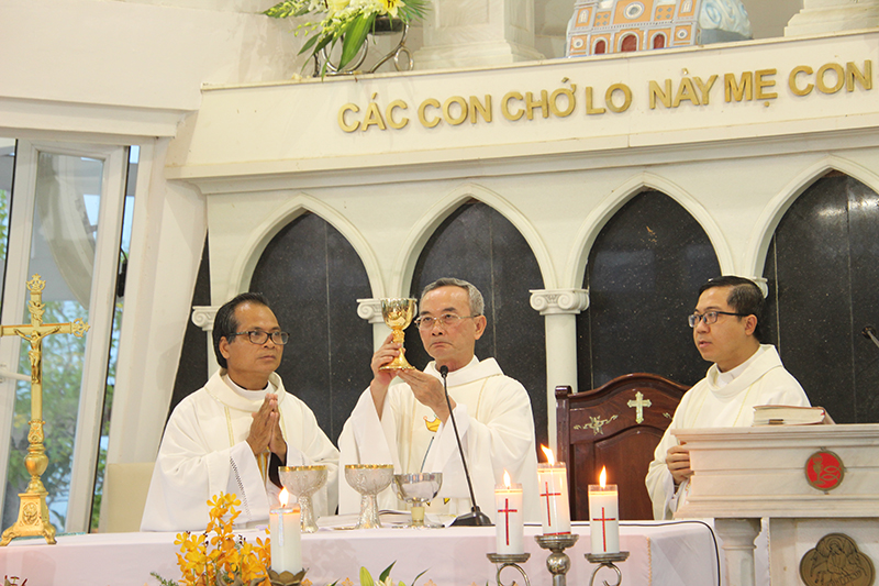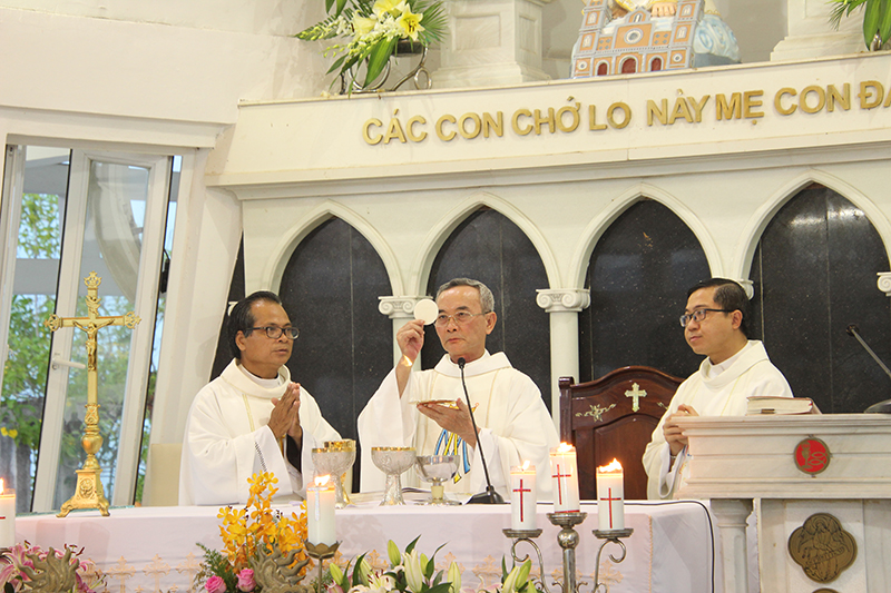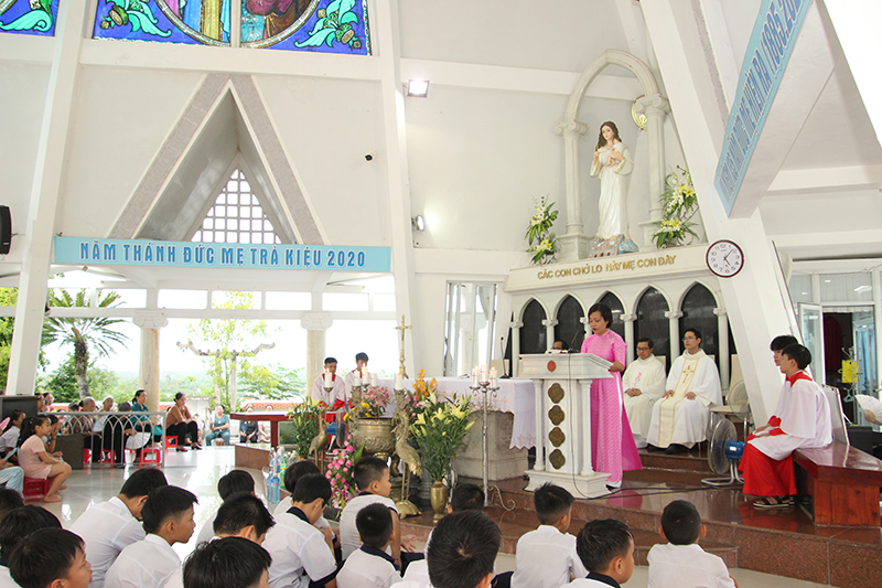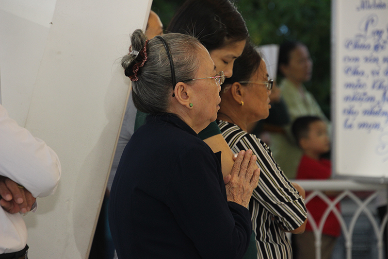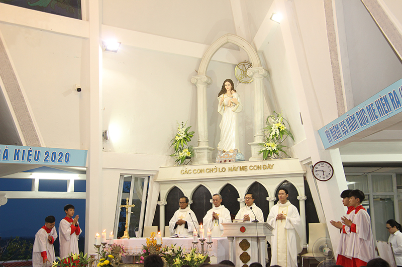 Sau Thánh lễ, cộng đoàn cùng cung nghinh Thánh tượng Đức Mẹ Trà Kiệu quanh 14 chặng đàng Thánh giá như thường lệ.