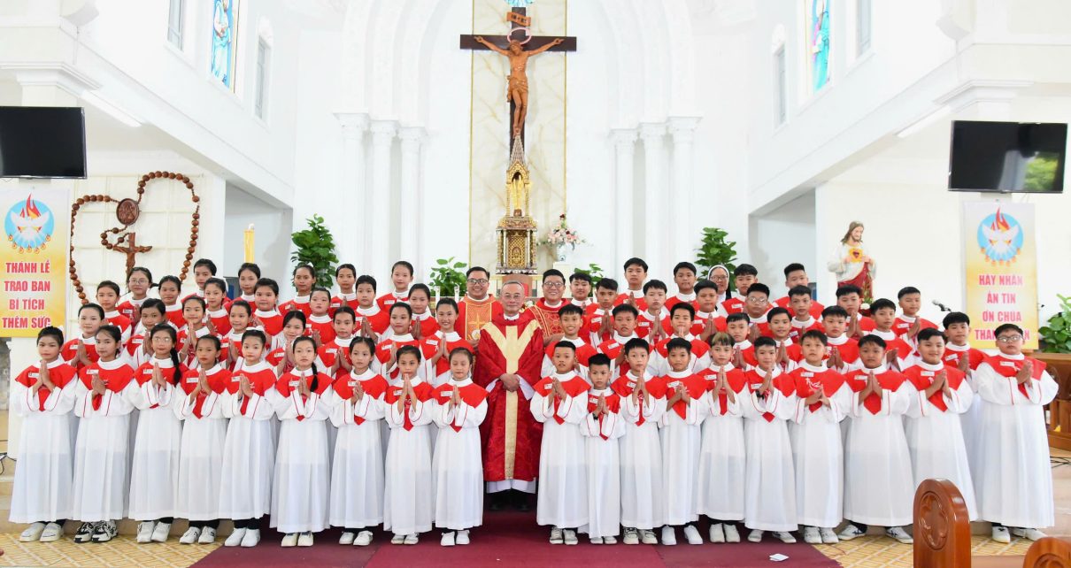 Sau những tháng ngày nỗ lực học hỏi giáo lý, cũng như chuyên cần tham dự Thánh lễ, sáng nay – Chúa nhật lễ Chúa Thánh Thần hiện xuống, 60 em giáo lý sinh thuộc khối lớp Hiệp Thông 6 hân hoan cùng với cha mẹ đỡ đầu, gia đình, người thân, cộng đoàn dân Chúa xứ Trà hiệp dâng Thánh lễ trao ban bí tích Thêm Sức do Cha Bonaventura Mai Thái – đại diện Giám quản Tông Toà Giáo phận Đà Nẵng chủ sự (sau đây gọi tắt là Cha đại diện).