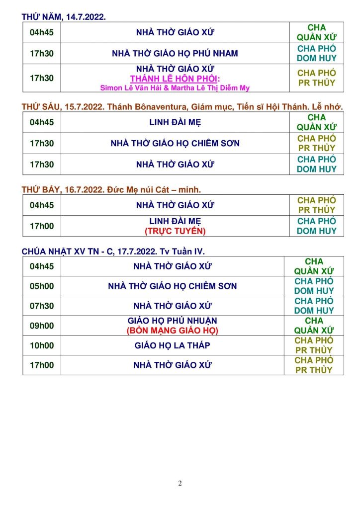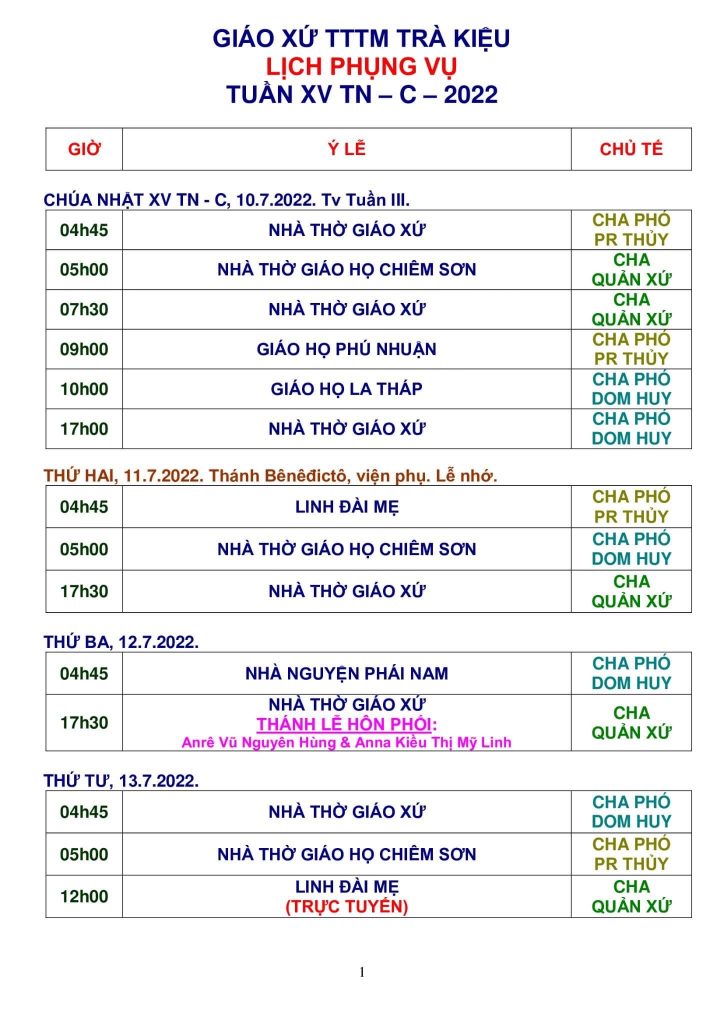 Thông Báo: Các Sinh Hoạt Trong Giáo Xứ Từ Ngày 18 – 25/11/2018