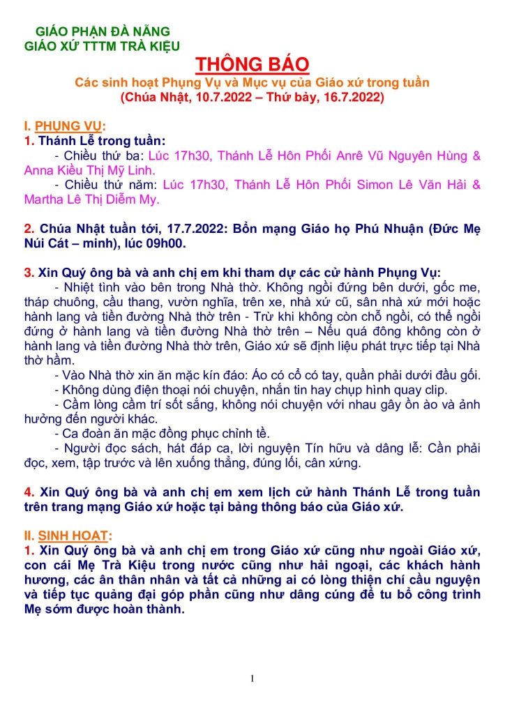GIÁO PHẬN ĐÀ NẴNG GIÁO XỨ TTTM TRÀ KIỆU THÔNG BÁO <<v/v các sinh hoạt trong giáo xứ>> (Chúa Nhật, 18/11 – Chúa Nhật, 25/11/2018) I. PHỤNG VỤ Chúa Nhật hôm nay, kính trọng thể các thánh Tử Đạo Việt Nam, bổn mạng của ca đoàn Tử Đạo giáo xứ chúng ta. Xin […]