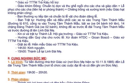1. Chiều Thứ Bảy tuần này, lúc 16g00 có thánh lễ cưới tại Nhà Nguyện Giáo họ Chiêm Sơn, nên không có thánh lễ tại Đài Mẹ.