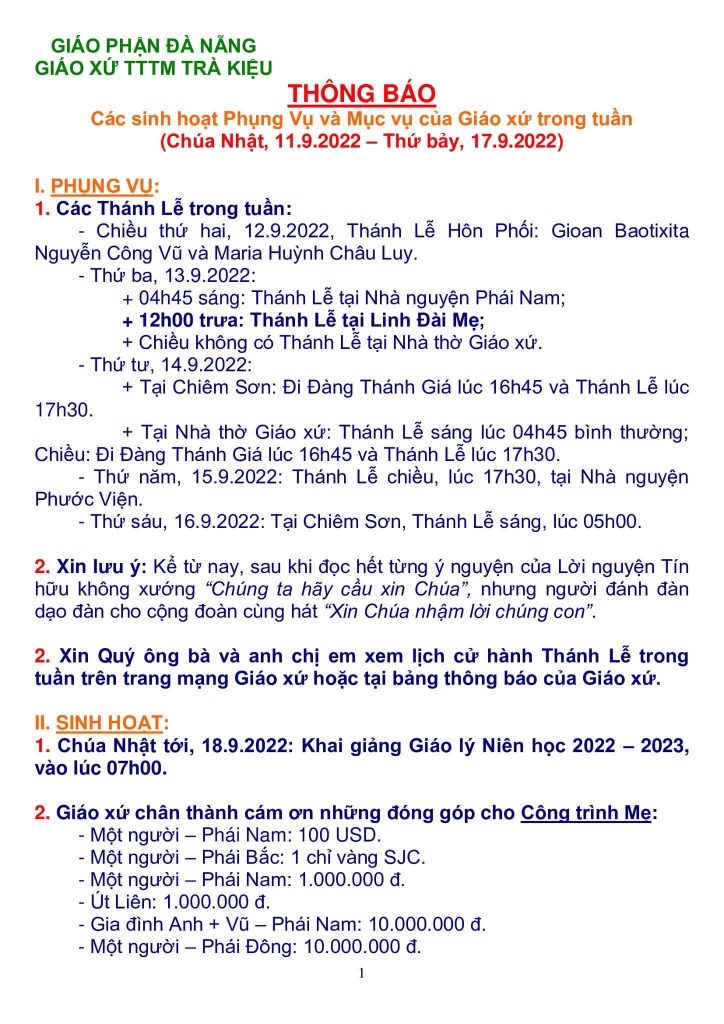 GIÁO PHẬN ĐÀ NẴNGGIÁO XỨ TTTM TRÀ KIỆU THÔNG BÁO Các sinh hoạt của Giáo xứ trong tuần (Chúa Nhật, 31.01.2021 – thứ Bảy, 06.02.2021) I. PHỤNG VỤ: 1. Chúa Nhật hôm nay, 31.01.2021: + Trong các Thánh Lễ, cộng đoàn hiệp ý cầu nguyện cho cha cố Phêrô Lê Như Hảo, nhân […]