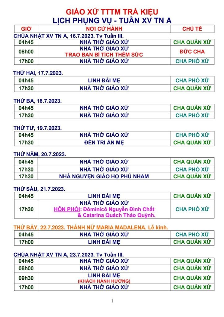 Thông Báo: Các Sinh Hoạt Trong Giáo Xứ Từ Ngày 26/8-03/9/2017