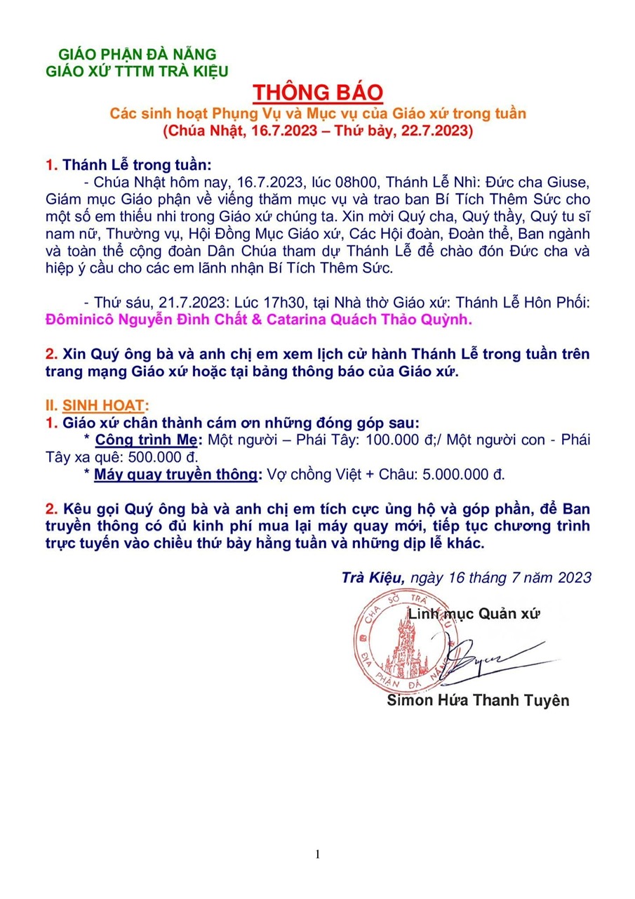 GIÁO PHẬN ĐÀ NẴNG GIÁO XỨ TTTM TRÀ KIỆU THÔNG BÁO << V/v các sinh hoạt trong giáo xứ >> (Chúa Nhật, ngày 26/8/2017 – 03/9/2017) I. Phụng Vụ 1/ Thứ hại, ngày 22/8/2017, Lễ thánh Augustinô, bổn mạng của quý thầy cô Công Giáo giáo xứ chúng ta. Mong anh chị em tham dự […]