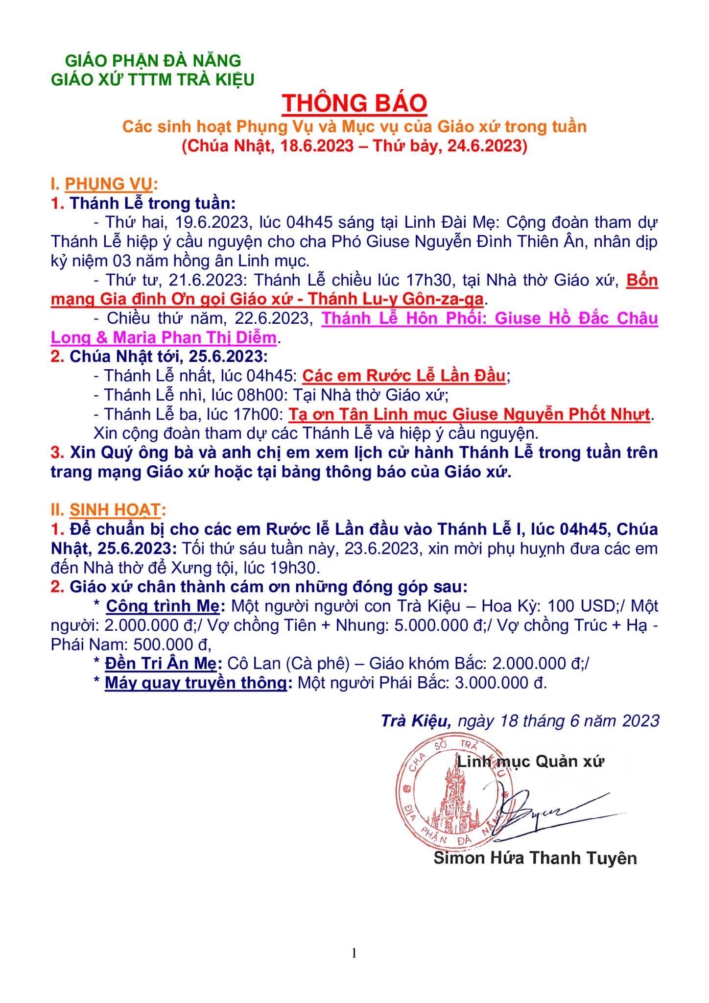 GIÁO PHẬN ĐÀ NẴNG GIÁO XỨ TTTM TRÀ KIỆU THÔNG BÁO << V/v các sinh hoạt trong giáo xứ >> (Chúa Nhật, ngày 23/7/2017 – 30/7/2017) I. Phụng Vụ 1/ Xin nhắc lại, mùa hè Thánh lễ II sáng Chúa Nhật bắt đầu lúc 08 giờ. 2/ Thứ ba, 25/7, Lễ thánh Giacôbê, […]