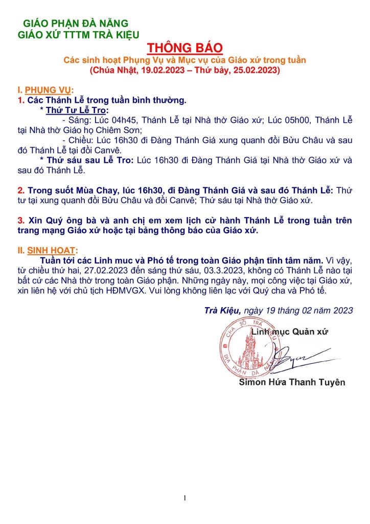 GIÁO PHẬN ĐÀ NẴNGGIÁO XỨ TTTM TRÀ KIỆU THÔNG BÁO Các sinh hoạt của Giáo xứ trong tuần (Chúa Nhật, 14.02.2021 – Thứ bảy, 20.02.2021) I. Phụng Vụ: 1. Thứ hai, 15.02.2021, nhằm Mồng Bốn Tháng Giêng âm lịch năm Tân Sửu: + Không có Thánh Lễ sáng lúc 04h45 tại nhà thờ […]