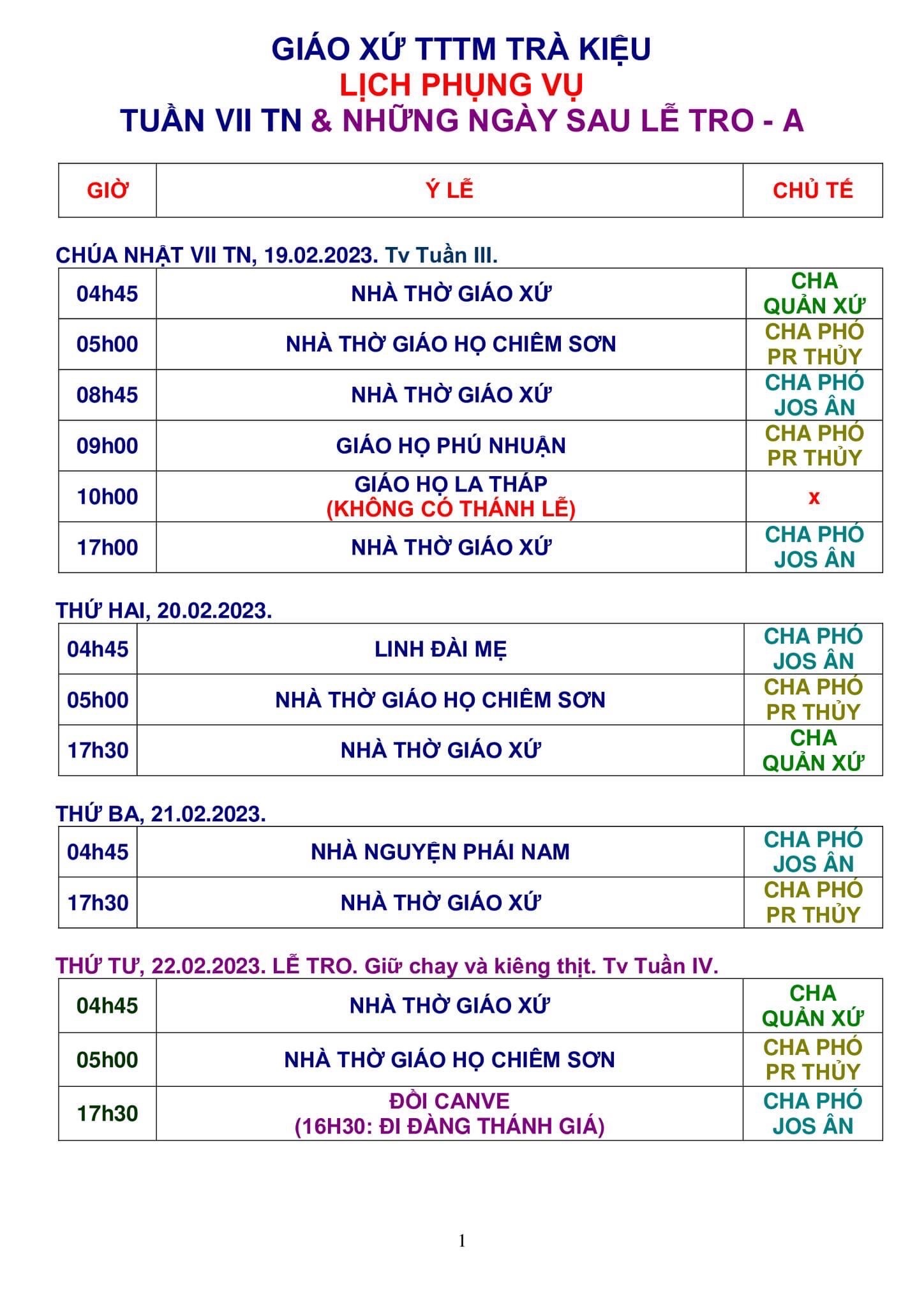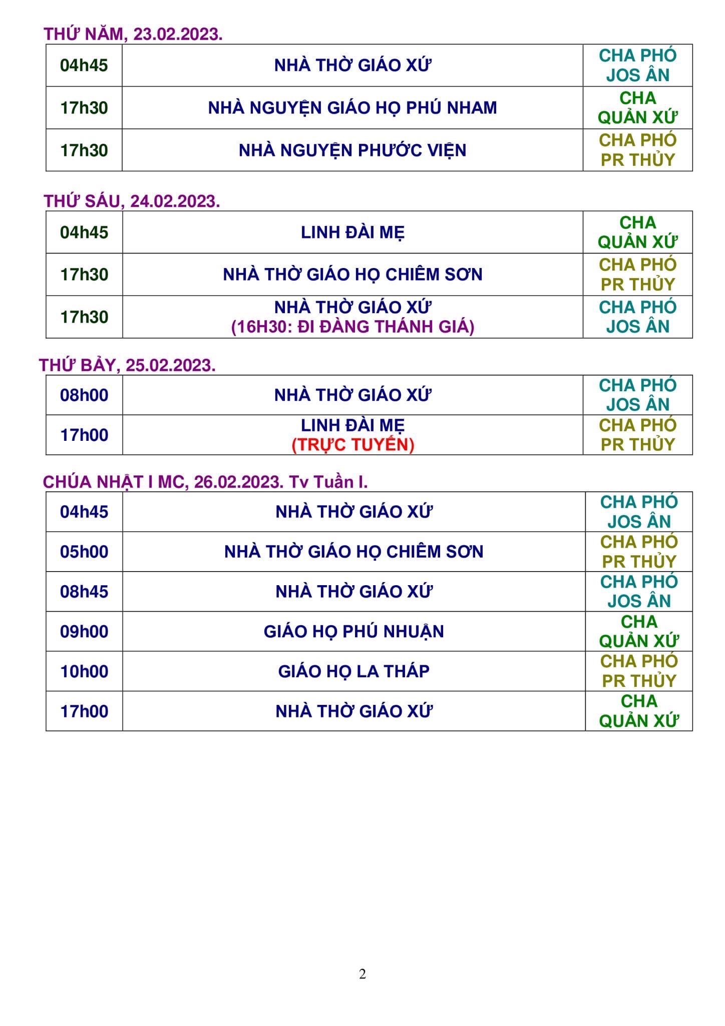 Thông Báo: Các Sinh Hoạt Trong Giáo Xứ Từ Ngày 14 – 20/02/2021