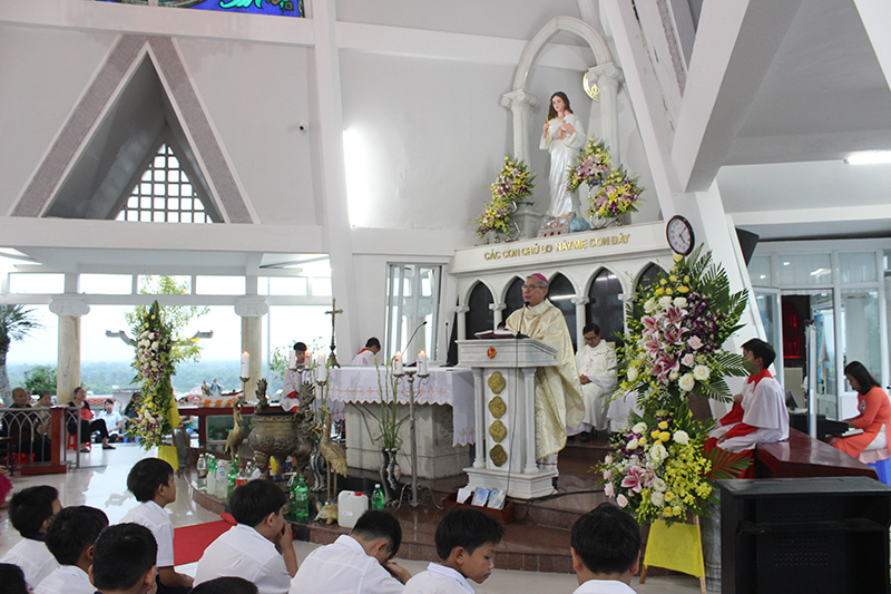 Sau khi làm phép tượng ảnh, nước… Đức Cha chia sẻ tâm tình của ngài: vì bận công việc mục vụ trong giáo phận những tháng qua, nên ngài không thể về dâng Thánh lễ đầu tháng tại nơi đây như ngài đã hứa. Lên đến đỉnh đồi thấy giáo dân ít hơn mọi khi, ngài tưởng là mọi người lơ là, nhưng không, đến khi chuẩn bị Thánh lễ, đoàn chiên của ngài vẫn hiện diện đông đảo như xưa, thật là một hình ảnh đẹp. Đức Cha Giuse cũng tỏ lời mừng khi thấy công trình quảng trường dưới chân đồi đã dần thành hình với sự cộng tác của mỗi người trong giáo xứ. Đây không chỉ là niềm vinh hạnh của giáo xứ mà còn của cả giáo phận khi có được công trình khang trang, đẹp đẽ để tôn vinh Chúa và Đức Maria. Ngài cầu chúc mọi điều tốt đẹp nhất đến với cộng đoàn giáo xứ cũng như quý khách hành hương. Thánh lễ kết thúc với phép lành trọng thể từ Đấng Bản Quyền giáo phận.