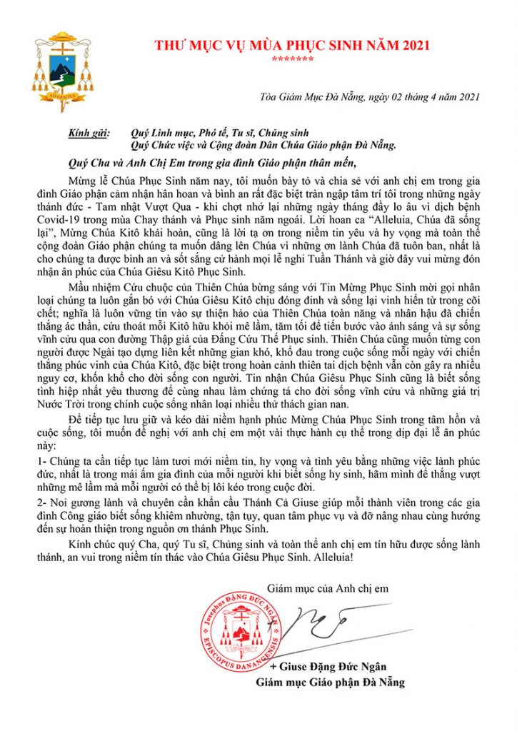 Thư Mục Vụ Mùa Phục Sinh Năm 2021 Của Đức Giám Mục Giáo Phận Đà Nẵng