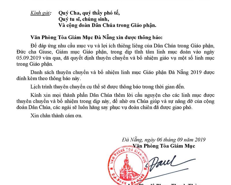 Thông Báo: Thuyên Chuyển Và Bổ Nhiệm Linh Mục Giáo Phận Đà Nẵng – 2019