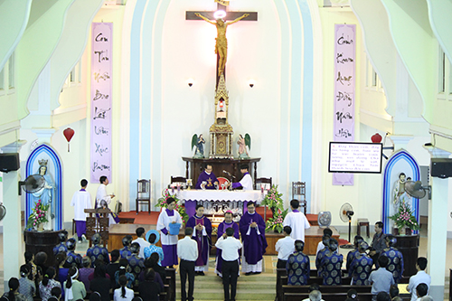 Lúc này, Đức Cha Giuse không thể kiềm nén được niềm vui của mình, bởi ngài thấy mọi sự được chuẩn bị một cách chu đáo từ phụng vụ, ca đoàn, đến mọi việc trong Thánh lễ hôm nay. Ngài thấy được sự chủ động trong mọi việc – sự trưởng thành dày dặn của một giáo xứ tiên khởi của giáo phận. Ngài cũng động viên cộng đoàn phụng vụ và khích lệ tinh thần phục vụ của mỗi cá nhân, đoàn thể trong cộng tác xây dựng giáo xứ, bởi đây chính là việc cộng tác với chính Đức Ki-tô, chứ không phải ai khác. Ngài cũng đã cảm ơn cộng đoàn phụng vụ đã dành những tình cảm tốt đẹp cho ngài và cầu chúc cho giáo xứ có một mùa Chay Thánh đầy ơn lành của Chúa.