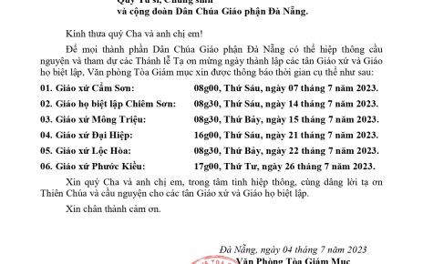 Sau khi nhận phép lành cuối lễ từ Đức Cha chủ tế, dù buồn vui xen lẫn lúc này, nhưng cộng đoàn chúng con luôn tin tưởng và phó thác mọi sự trong tay Chúa và Đức Mẹ Trà Kiệu, để các Ngài hướng dẫn chúng con trong mọi suy nghĩ, lời nói, hành động hầu cùng nhau xây dựng giáo xứ ngày càng đạo đức, thánh thiện và hưng thịnh hơn trong Tình Yêu Chúa. Amen.