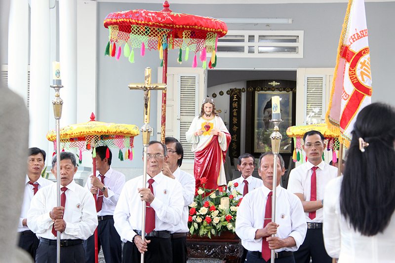 Sau đó, cuộc cung nghinh Thánh Tâm Chúa Giê-su bắt đầu, trước hết là Thánh Giá, đèn hầu, Cờ hiệu Gia Đình Phạt Tạ, các em thiếu nhi, cộng đoàn dân Chúa, quý hội viên trong hội đoàn Gia Đình Phạt Tạ, cha chủ sự cuộc cung nghinh và bàn kiệu Thánh Tâm Chúa.