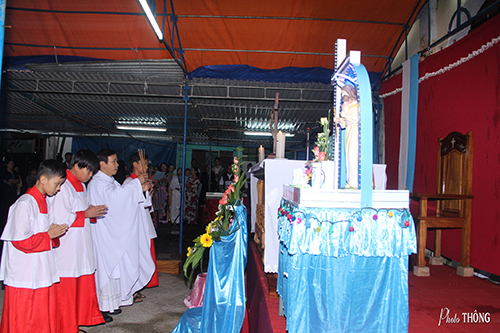 Trong lời ca nhập lễ vang vọng từ ca đoàn Teresa: “Từ khắp muôn phương đoàn con về đây bên Mẹ…”, đoàn rước từ Đền Mẹ Tri Ân tiến về lễ đài trên đồi chữ A, khai mở Thánh lễ. Cha Đại diện Giám quản Tông Tòa giáo phận, Bonaventura Mai Thái, trong tâm tình hiệp thông cùng Đức Tổng Giám Mục Giuse Đặng Đức Ngân, ngỏ lời chào quý Cha, tu sĩ, chủng sinh và toàn thể cộng đoàn phụng vụ. Với chủ đề “Đức Mẹ là Ngôi Sao Sáng”, ngài nhấn mạnh vai trò hướng dẫn và đồng hành của Mẹ trong đời sống đức tin, khích lệ cộng đoàn hãy siêng năng cầu nguyện, tín thác nơi Mẹ để được Mẹ dẫn đưa đến nguồn cậy trông đích thực là Chúa Kitô.