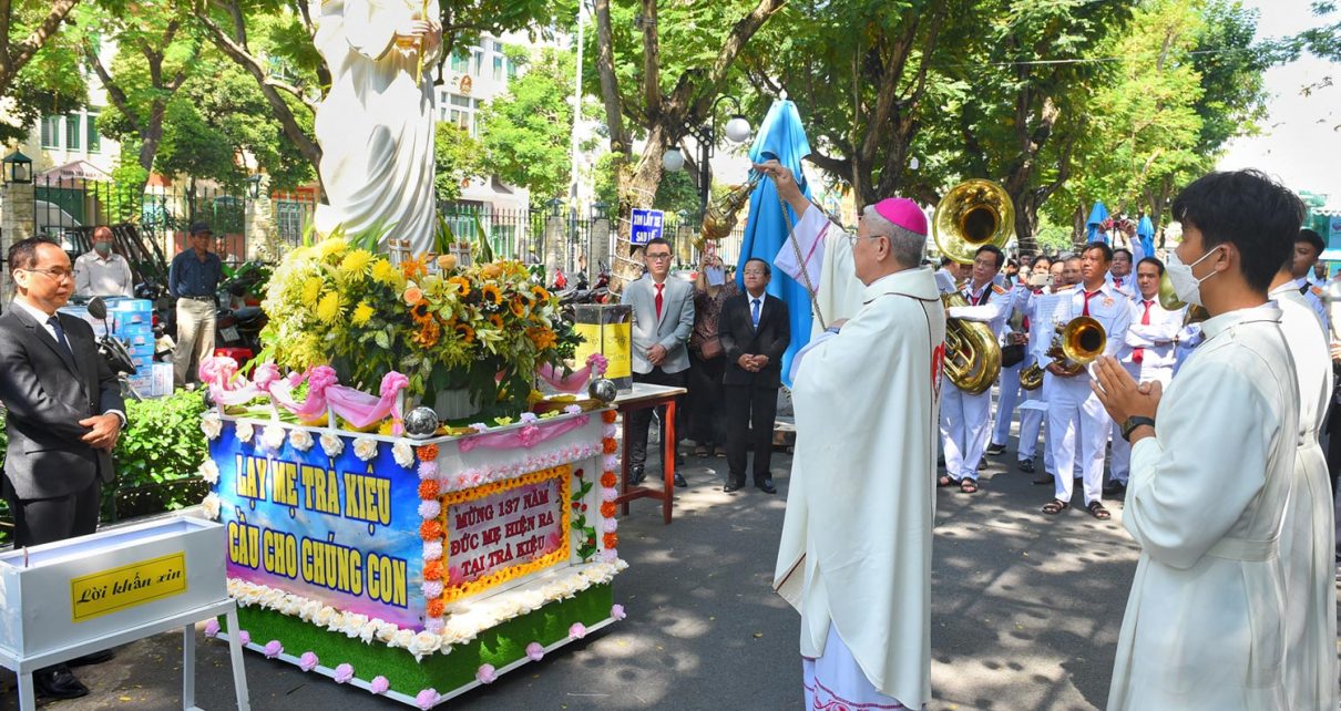Chúng ta mừng lễ tôn vinh Đức Mẹ Trà Kiệu trong Tháng 10, tháng Đức Mẹ Mân Côi. Chúng ta hãy để cho tình yêu của Thiên Chúa chạm tới cuộc sống mình, như năm xưa Thiên Chúa đã chạm tới cuộc đời Đức Maria. Hôm nay, anh chị em di dân giáo phận Đà Nẵng đã họp nhau tại đây mừng lễ Đức Mẹ Trà Kiệu, là ngày vui mừng của con cái Đức Mẹ Trà Kiệu khắp nơi.