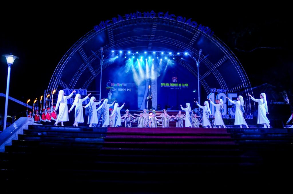 Chương trình tôn vinh cũng là buổi biểu diễn phong phú tiết mục và thành phần tham gia được tổ chức trên sân khấu (cũng là lễ đài chính) tại quảng trường Mân Côi. Các diễn viên, ca viên của chương trình cũng đã chuẩn bị sẵn để cùng với cộng đoàn tham dự hân hoan vẫy cờ chào đón quý Đức Cha Giuse Đặng Đức Ngân, Đức Cha Emmanuel Nguyễn Hồng Sơn, giám mục giáo phận Bà Rịa – Vũng Tàu; và sau đó là Đức Cha Mattheu Nguyễn văn Khôi từ Quy Nhơn đến tham dự đêm hoan ca diễn nguyện. Bài nhạc trống của đội trống giáo xứ TTTM Trà Kiệu như lời chào mừng nồng nhiệt đến với cộng đoàn tham dự đêm hoan ca cùng với lời giới thiệu trang trọng của các MC hân hoan chào đón Đức Cha Giuse, giám mục giáo phận khai mạc đêm hoan ca tôn vinh Đức Mẹ Trà Kiệu. 16 tiết mục của chương trình hoan ca là sự hội tụ nghệ thuật và dấu ấn đức tin từ các giáo xứ. Có một tiết mục đặc biệt trong đêm hoan ca là phần công bố kết quả của cuộc thi sáng tác với chủ đề về Đức Mẹ Trà Kiệu với các thể loại thơ, văn, nhạc, họa và các loại hình nghệ thuật khác. Chung cuộc, chỉ có thể loại thơ, văn và nhạc được trao giải; các thể loại khác vì số tác phẩm tham gia dự thi không nhiều nên không công bố kết quả. Đức Cha Giuse, chủ tịch danh dự cuộc thi sáng tác đã tận tay trao giải thưởng cho các tác giả có tác phẩm được xếp hạng cao. Có 2 ca khúc đoạt giải thưởng được công diễn tiếp theo, để cộng đoàn thưởng lãm, tuy trước đó, nhiều ca đoàn trong giáo phận đã chia sẻ và lưu hành những ca khúc này (được giới thiệu trên website giáo phận). Có 2 bản hợp ca được trình tấu trong đêm hoan ca với số lượng ca viên tham gia khá đông là ca đoàn thiếu nhi của giáo xứ Tam Tòa (với nhạc phẩm “Kính Mừng”) và ca đoàn tổng hợp giáo xứ Thanh Đức (nhạc phẩm “Ave Maria II” – Nhạc sĩ Hải Linh phổ thơ của Thi sĩ Hàn Mạc Tử). Các giáo xứ Trà Kiệu, Phước Tường, Hòa Khánh, Hoằng Phước, Hà Lam, An Hải cùng với Giới Trẻ và Sinh viên Công giáo Giáo phận tham gia những tiết mục múa, hát, nhạc cảnh nhiều cảm xúc. Đặc biệt, là quý soeurs Dòng Thánh Phaolo thành Chartres đã cống hiến cho cộng đoàn một hoạt cảnh cảm động được dàn dựng và thực hiện công phu (với 2 phân đoạn) về Đấng Đáng Kính Phanxicô Xavie Nguyễn Văn Thuận, vị chứng nhân của niềm hi vọng trong thời hiện đại. Dù cơn mưa chiều vẫn kéo dài và càng về đêm càng thêm nặng hạt, nhưng chương trình hoan ca đầy ắp nghĩa tình này vẫn giữ chân được quý Đức Cha và cộng đoàn tham dự đến phút cuối, khi Đức Cha Giuse, thay mặt ban tổ chức Năm Thánh và Đêm Hoan Ca nói lời cám ơn, hát và ban phép lành kết thúc cuộc hội diễn đạo đức và nghệ thuật này lúc 21 giờ 30. Cũng cần phải ghi nhận nỗ lực của các thành viên trong ban Âm thanh – Ánh sáng và ban Mục vụ Truyền Thông giáo phận đã cố gắng khắc chế những bất tiện do thời tiết để bảo đảm khung cảnh trang trọng cũng như việc trực tuyến được tiến hành tốt đẹp. Bài ca “Lạy Mẹ Trà Kiệu mến yêu”, một lần nữa lại âm vang cả khoảng trời đồi núi Bửu Châu trong đêm canh thức bế mạc Năm Thánh hồng ân này.