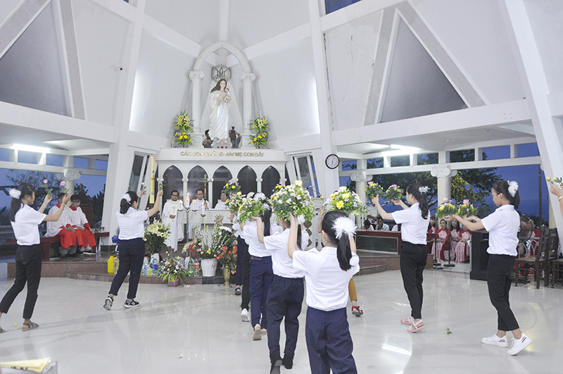 Sau khi kết thúc những chục kinh Mân Côi, đoàn con Mẹ đến từ 02 giáo xứ bạn đã tiến lên dâng Mẹ những cánh hồng chứa đựng cả tâm tình con thảo của mình. Tiếp đến, trong tư cách chủ nhà, các em thiếu nhi giáo xứ Trung Tâm Thánh Mẫu Trà Kiệu (TTTM TK) thay mặt cộng đoàn phụng vụ dâng lên Mẹ những vũ điệu đơn sơ thể hiện lòng tôn kính của đoàn con thơ với Mẹ Hiền kính mến của mình.
