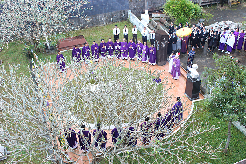 Sau phép lành trọng thể, Đức Cha chủ tế, đoàn đồng tế cùng cộng đoàn phụng vụ tiến về Vườn Nghĩa để viếng mộ Đức Cha tiên khởi và dâng lên ngài những nén hương, câu kinh để tỏ tấm lòng hiếu thảo của mình.