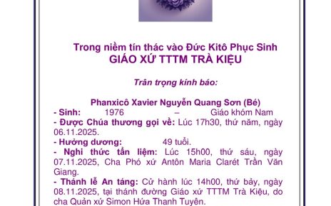 Thánh lễ an táng lúc 14g00 ngày 29/12/2017 tại thánh đường Trà Kiệu
