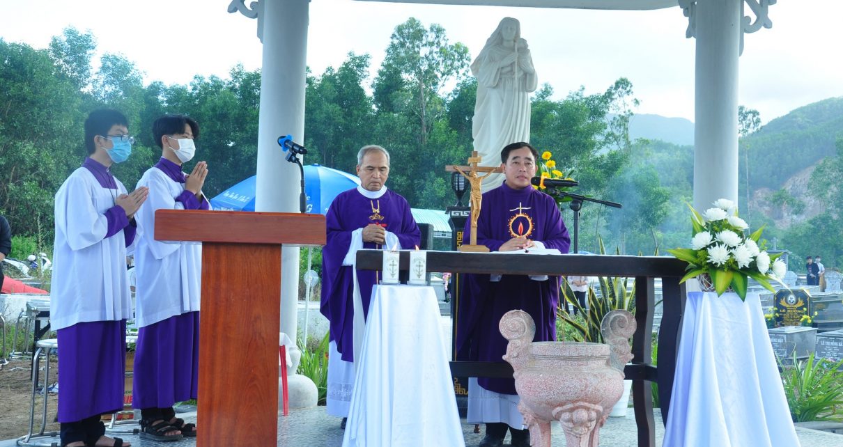 Sau Thánh lễ sáng nay được cha quản xứ Simon chủ sự tại nhà thờ chính, chiều cùng ngày, lúc 15h00 đồng thời tại 02 nghĩa trang Cửa Hẩn và Đồng Quảng được cử hành bởi các cha xuất thân từ quê nhà Trà Kiệu, gồm: cha Marcello Đoàn Minh, cha Philipphê Trương Văn Long (tại Cửa Hẩn) và cha Ambrôsiô Nguyễn Quang Minh (tại Đồng Quảng).
