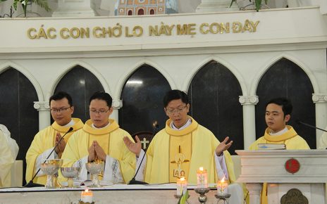 Tiếp đến, Cha Bonaventura Mai Thái – Đại diện Giám quản Tông Tòa giới thiệu 06 tiến chức cho Đức Cha Giuse. Trong phần huấn dụ của mình, Đức Cha Giuse đã nhấn mạnh với cộng đoàn phụng vụ tinh thần “hãy ở lại trong Thầy” để được “ở trong tình thương của Thầy”, được sinh hoa kết quả trong Tình Yêu vô điều kiện, nhưng không của Thiên Chúa. Với Tình Yêu này, Chúa sẽ giúp cho mỗi người tham dự vào sứ mạng loan báo Tin Mừng mà Ngài đã trao phó. Nhưng làm thế nào để ở lại trong Tình Yêu của Chúa? Đức Cha Giuse đã mời gọi mỗi người hãy biết “yêu thương nhau như Thầy đã yêu thương anh em”: hãy thoát ra khỏi mình, hãy mở lòng mình với người khác, luôn tôn trọng tha nhân và sẵn sàng yêu thương bằng hành động thiết thực… Khi sống phục vụ trong đức ái, mỗi người đã trở thành Ki-tô hữu đích thực mang lại hoa trái yêu thương cho anh chị em xung quanh. Dịp này, Đức Cha Giuse cũng nhắc lại lịch sử của nhà thờ Chính Tòa được xây dựng từ năm 1923 – là ngôi nhà thờ gắn kết, thắt chặt mọi thành phần dân Chúa trong giáo phận. Với Năm Thánh mừng bách chu niên từ ngày 18/01 – 14-9/2024, Đức Cha Giuse mong ước mọi thành phần dân Chúa sẽ kín múc được ơn Thánh trong thời gian này hầu đem lại những lợi ích thiêng liêng trong hành trình sống đức tin và loan báo Tin Mừng. Cuối cùng, với các tiến chức phó tế, ngài nhấn mạnh: anh em hãy hân hoan phục vụ Chúa và tha nhân trong đời sống độc thân tận hiến, hãy sống trong sạch, không được để mất tin cậy vào Phúc Âm mà hãy sống minh chứng Lời Chúa qua đời sống phục vụ của mình… Đức Cha Giuse nguyện xin Chúa Thánh Thần biến đổi quý thầy để mỗi tiến chức trở nên môn đệ đích thực của Chúa.