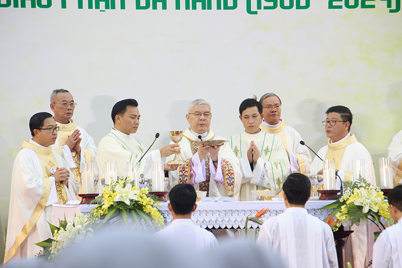 Trước khi kết thúc Thánh lễ, thầy Philipphê đã đại diện các tân Phó tế dâng lời cảm tạ, tri ân đến quý Đức Cha, quý Cha, quý tu sĩ nam nữ, chủng sinh, quý ông bà cố, quý ân thân nhân, cộng đoàn phụng vụ… đã đến hiệp dâng Thánh lễ hôm nay, cũng như cầu nguyện và giúp đỡ quý thầy trong suốt thời gian qua. Sau đó, Cha đại diện Giám quản Tông Tòa cũng đã ngỏ lời cảm tạ Thiên Chúa, Đức Mẹ Trà Kiệu, Chân phước Anrê Phú Yên vì muôn ơn lành tuôn đổ trên giáo phận nhà trong suốt thời gian qua. Ngài cũng có đôi lời cảm ơn đến Đức Cha Giuse, quý Cha, quý tu sĩ nam nữ, các giáo xứ, các ban ngành đoàn thể trong giáo phận, các dòng tu đã dành mọi tâm tình, công sức để Thánh lễ được trang trọng và tốt đẹp và không quên xin mọi người tiếp tục cầu nguyện cho giáo phận. Tiếp đến, cộng đoàn phụng vụ cùng hiệp lòng dâng lời tạ ơn Thiên Chúa với các em trong đội dâng vũ trong vũ khúc “Tán tụng hồng ân”.