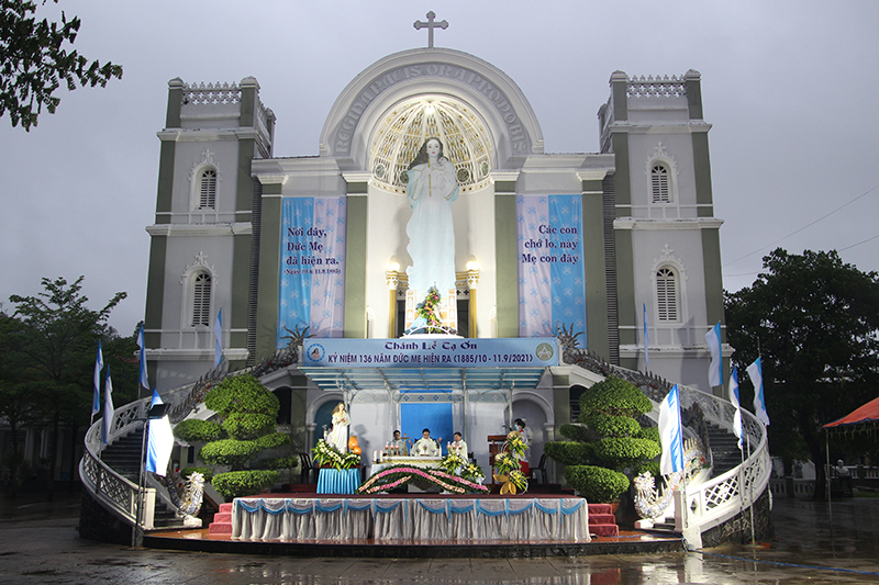 Từ sáng đến chiều 11/9/2021, mưa vẫn cứ đổ, gió vẫn cứ gào, con cái Mẹ ở giáo xứ sở tại vẫn cứ tiếp tục chương trình như đã định. Nhưng lạ thay: đến 17h00, khi đoàn rước tiến lên lễ đài, trời lại tạnh hẳn. Khi cha chủ tế Simon, quý cha đồng tế gồm cha phụ tá An-tôn, cha hạt trưởng Philipphê – hạt trưởng hạt Trà Kiệu, cùng cộng đoàn yên vị tại nơi của mình thì trời lại đổ mưa. Thật lạ lùng!