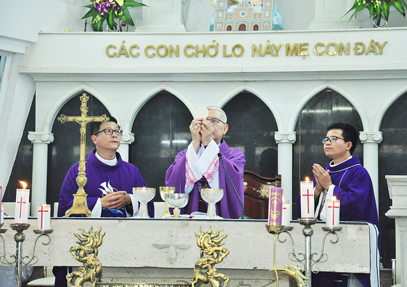 Theo thông lệ đã định, chiều hôm nay – thứ Bảy đầu tháng 3/2021, Đức Cha Giuse lại về với giáo xứ Trung Tâm Thánh Mẫu Trà Kiệu để hiệp dâng Thánh lễ tạ ơn cùng với Mẹ Hiền của giáo phận. Mở đầu Thánh lễ, Đức Cha Giuse ngỏ lời chào đến quý cha, quý thầy phó tế, quý soeurs, quý chức cùng toàn thể cộng đoàn dân Chúa đang hiện diện nơi linh đài Bửu Châu. Trong tinh thần của ngày thứ Bảy đầu tháng, ngài mời gọi mỗi người hãy cảm nhận những giá trị yêu thương xuất phát từ lời mời gọi của Mẹ Trà Kiệu năm xưa: “Các con chớ lo, này Mẹ con đây”, cũng như lời mời gọi của Đức Thánh Cha Phan-xi-cô: “hãy làm mới lại giá trị tình yêu”. Mỗi người chúng ta đã làm gì đáp lại những lời mời gọi đó? Hãy cùng hiệp dâng Thánh lễ, lắng nghe phụng vụ Lời Chúa hôm nay và cầu xin Chúa ban ơn trợ giúp cho mỗi người.