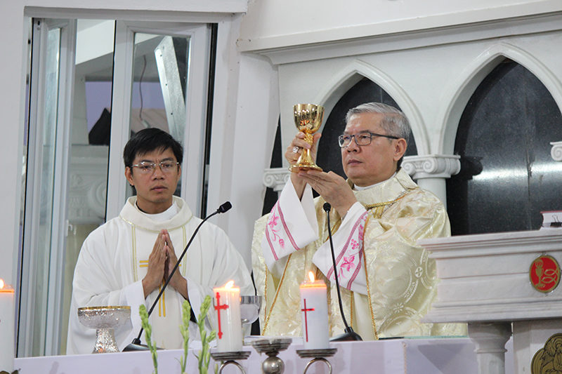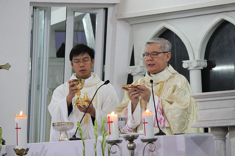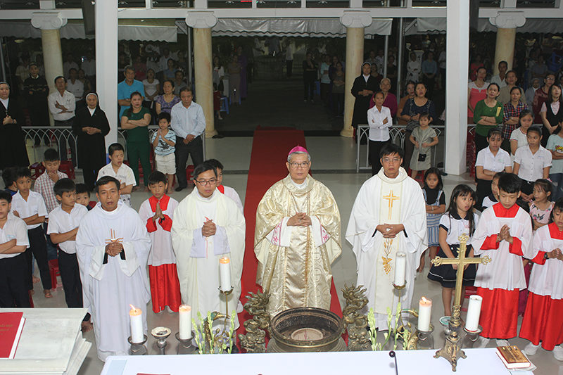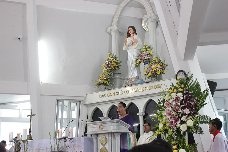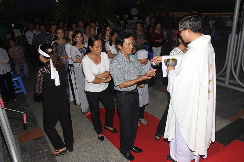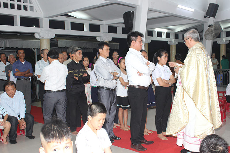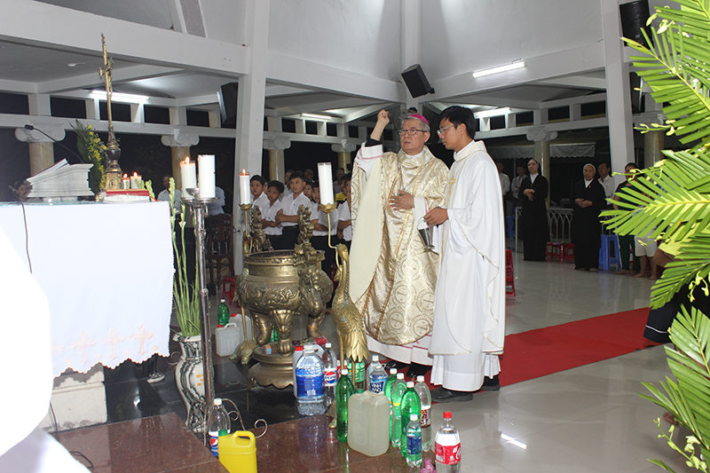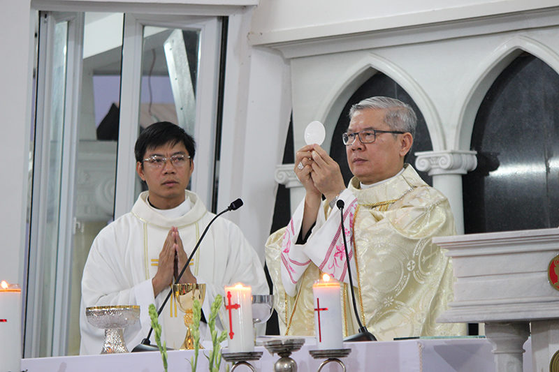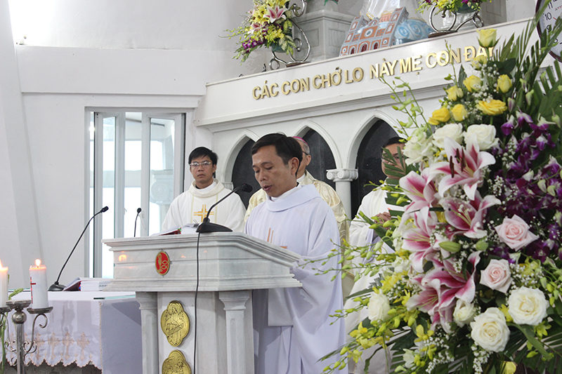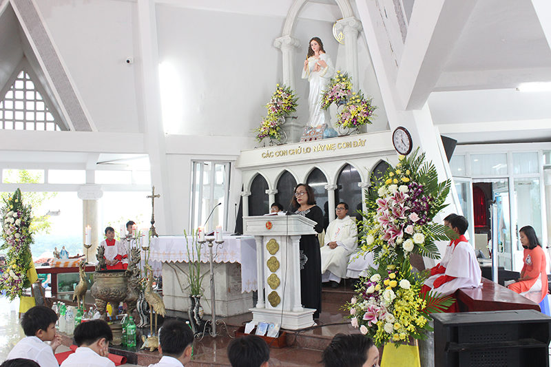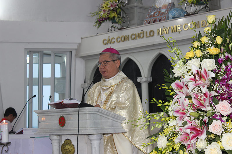 Sau khi làm phép tượng ảnh, nước… Đức Cha chia sẻ tâm tình của ngài: vì bận công việc mục vụ trong giáo phận những tháng qua, nên ngài không thể về dâng Thánh lễ đầu tháng tại nơi đây như ngài đã hứa. Lên đến đỉnh đồi thấy giáo dân ít hơn mọi khi, ngài tưởng là mọi người lơ là, nhưng không, đến khi chuẩn bị Thánh lễ, đoàn chiên của ngài vẫn hiện diện đông đảo như xưa, thật là một hình ảnh đẹp. Đức Cha Giuse cũng tỏ lời mừng khi thấy công trình quảng trường dưới chân đồi đã dần thành hình với sự cộng tác của mỗi người trong giáo xứ. Đây không chỉ là niềm vinh hạnh của giáo xứ mà còn của cả giáo phận khi có được công trình khang trang, đẹp đẽ để tôn vinh Chúa và Đức Maria. Ngài cầu chúc mọi điều tốt đẹp nhất đến với cộng đoàn giáo xứ cũng như quý khách hành hương. Thánh lễ kết thúc với phép lành trọng thể từ Đấng Bản Quyền giáo phận.